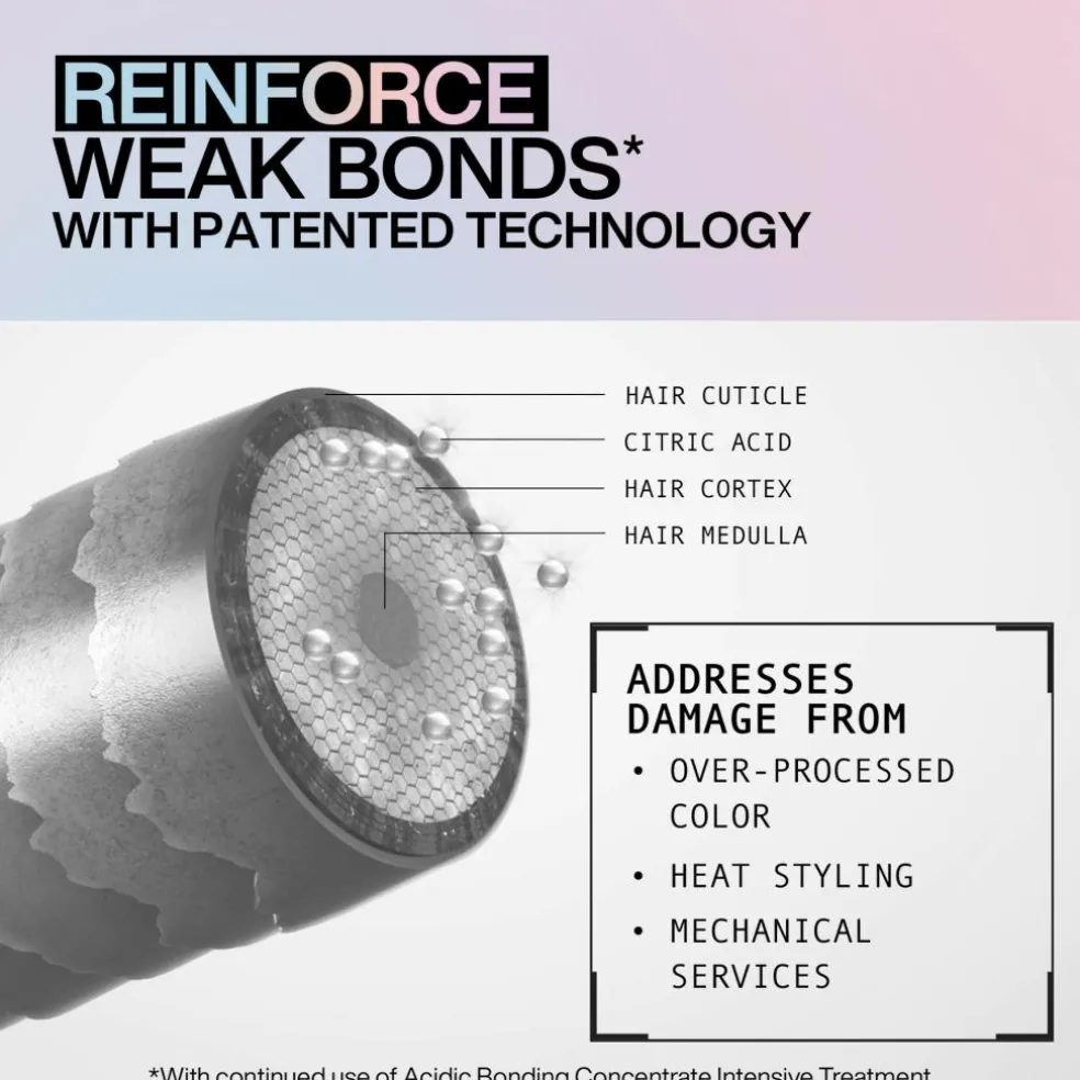 Med 7 % bonding care complex og alfa hydroxysyre, citronsyre styrker Acidic Bonding Concentrate Shampoo svage bindinger og forstærker hårets modstandsstyrke. Denne pH-balancerede shampoo er specielt formuleret med en syreholdig pH-værdi, der bekæmper de negative effekter af hårfarve, varmestylingapparater og endda vand. Resultatet? Hår der ser sundt ud og føles lige sådan!