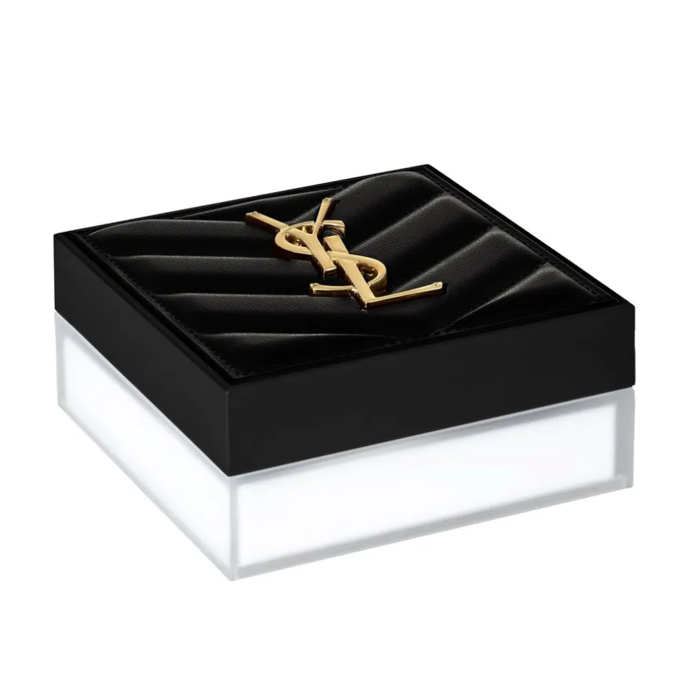 YSLs ikoniske chevron-design pryder den frostede krukke med praktisk chevron-si. Den bløde puff-applikator sikrer en jævn og naturlig påføring. Fuldendes med en couture-lædertop og guld Cassandre-logo.