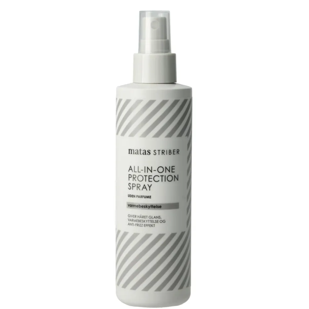 Bnyt Matas All-In-One Protection Spray i håndklædetørt hår, og fordel det jævnt i hele håret. Spray med en afstand på 20-30 cm i håret, og benyt derefter føntørrer for at aktivere anti-frizz effekten. Skal ikke skylles ud. Husk aldrig at bruge krølle- eller glattejern i vådt hår, da det kan skade håret.