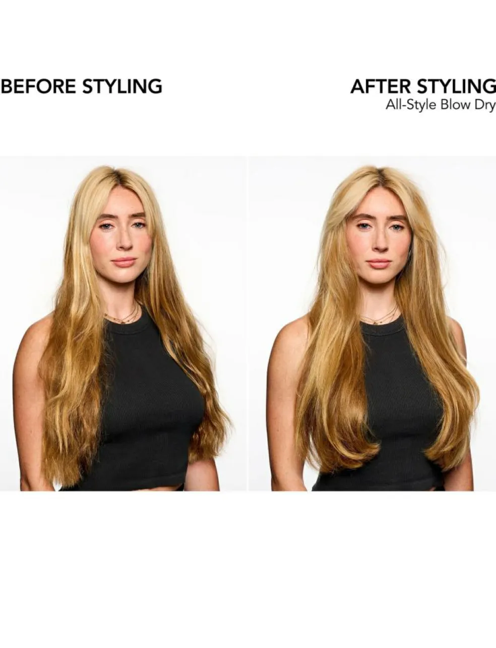 En varmebeskyttende føn-creme, der giver bounce, glans og volumen, samtidig med at den dæmper frizz. Usynligt, mikrofint olieabsorberende pudder holder frisuren frisk længere—ideel til sundt, fint og/eller hurtigt fedtet hår. Fordel en lille mængde jævnt i fugtigt hår og føn i sektioner: brug flad børste for et glat resultat eller rundbørste for bevægelse og bløde bølger; til helt glat hår kan du afslutte med glattejern.