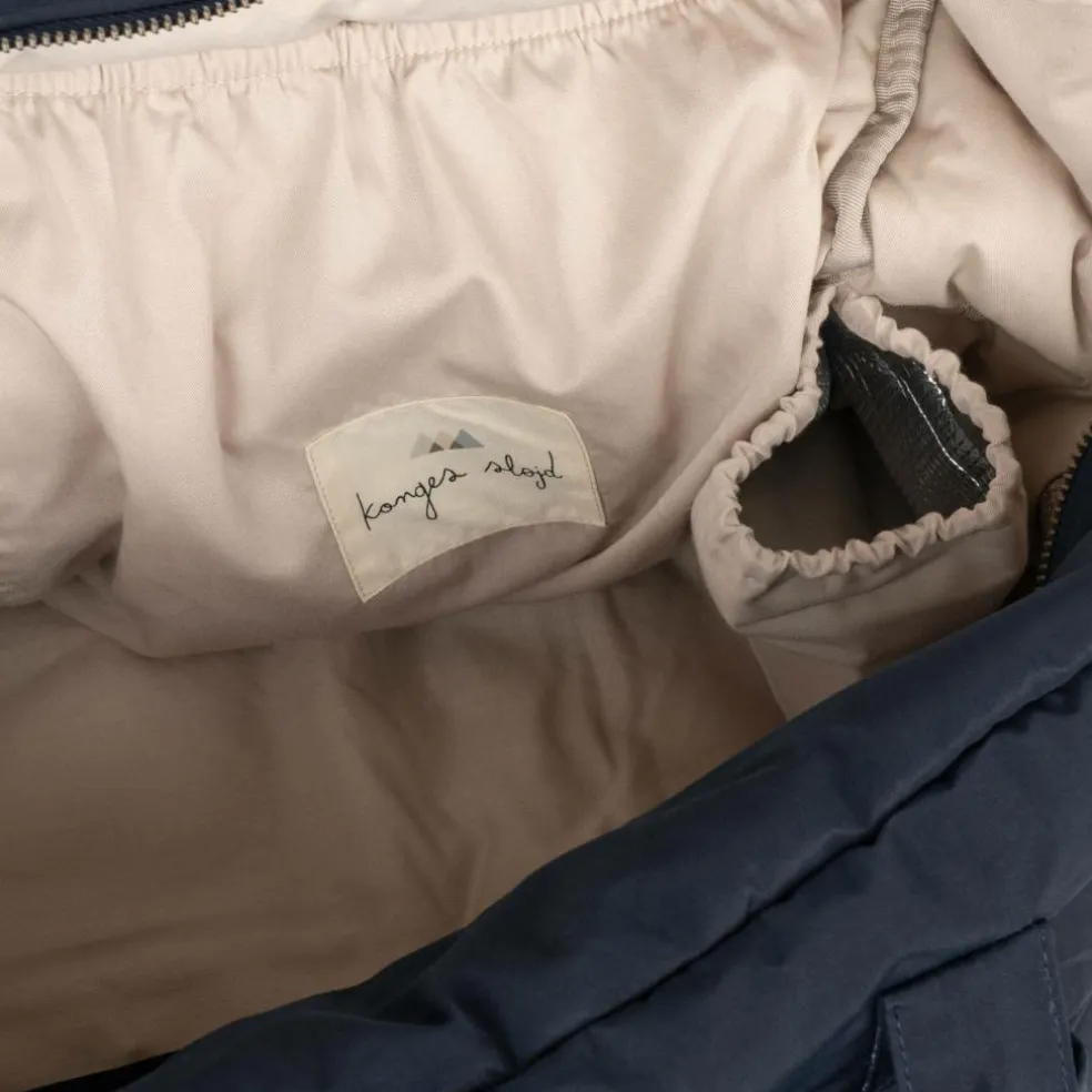 På ydersiden er der to lommer, én af dem særligt designet til at indeholde vådservietter. Tasken inkluderer en udtagelig, polstret skiftepude. Tasken har stor opbevaringskapacitet og kan også bruges som weekendtaske. Den har en aftagelig og justerbar skulderstrop og et grab-and-go håndtag.