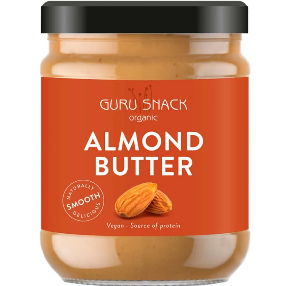Økologisk mandelsmør fra Guru Snack, der er det perfekte smørepålæg.