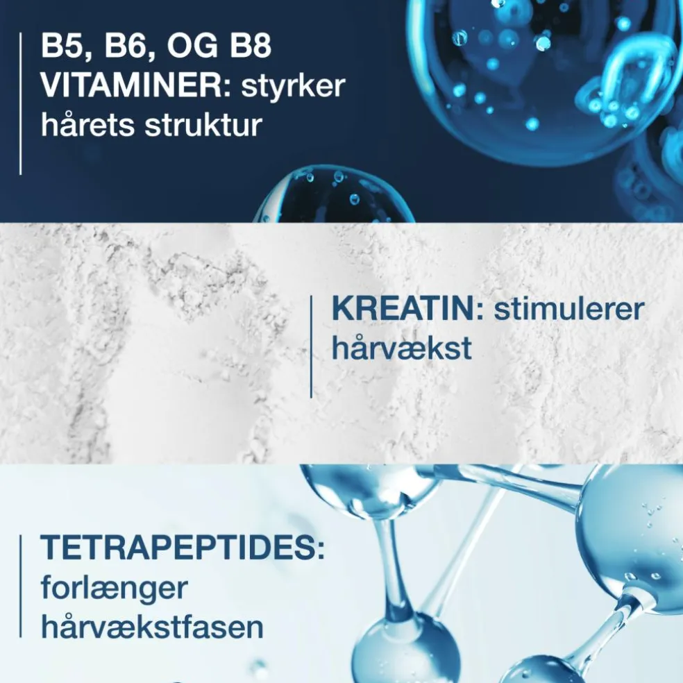 Den styrker hårets struktur, mindsker hårtab og genaktiverer væksten og håret vil se mere tæt ud. Kan anvendes af gravide (fra 2. trimester og frem) og af ammende kvinder og til personer, der er under kræftbehandling.