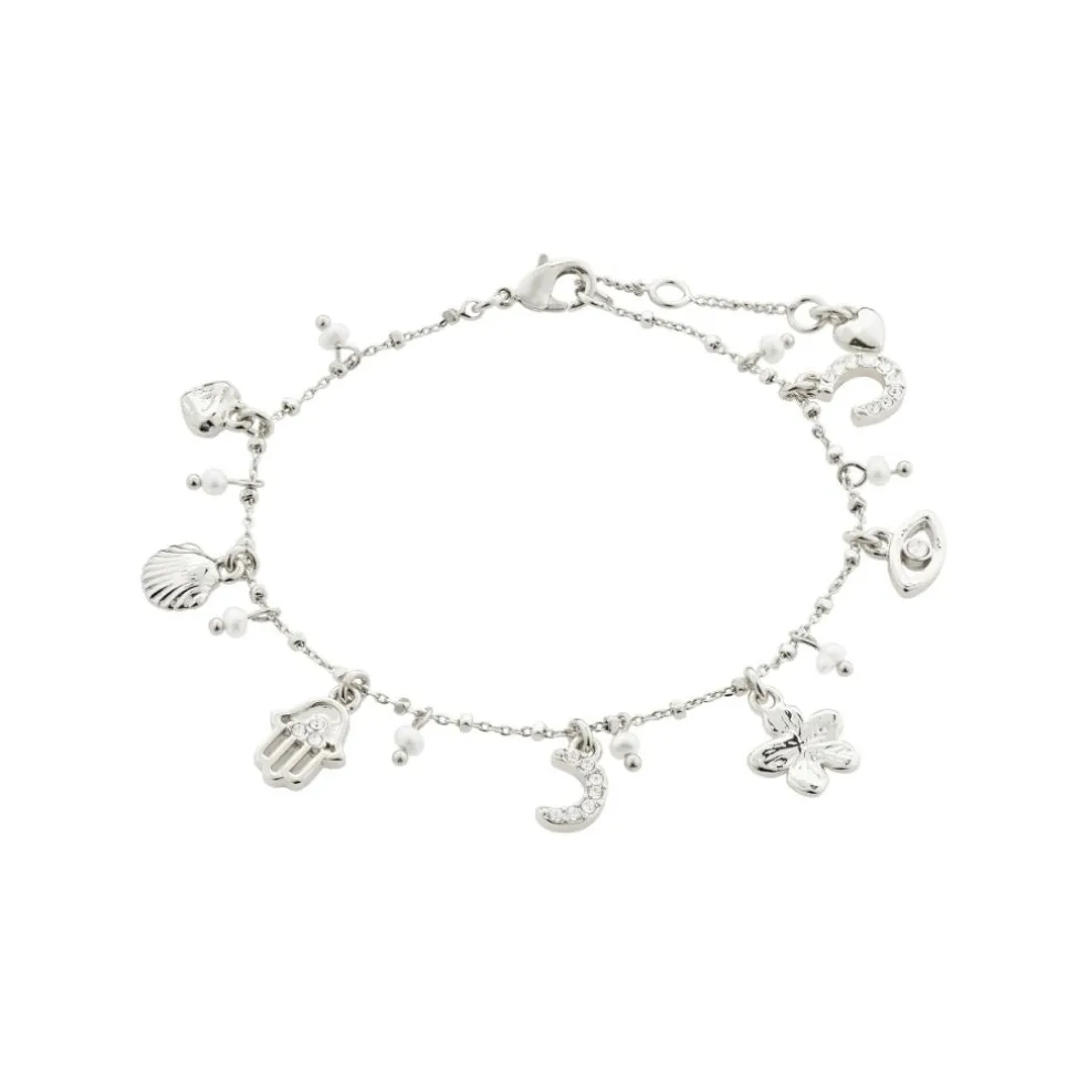 Embrace new adventures, med det sølvbelagte PRUCENCE-armbånd fra Pilgrim. Et romantisk virvar af små charms, der spinner en fortælling om kærlighed, drømme og lykke. Hver charm fra hjerte til måne, hestesko til Hamsa, muslingeskal til det altseende øje, er et hint til eventyret i hverdagen. De tiny ferskvandsperler og glitrende Preciosa-krystaller giver armbåndet en drømmende vibe, mens den rige symbolik løfter din spirit og tilføjer et personligt præg. Skabt med passion af 90% genanvendt materiale er PRUCENCE-armbåndet et valg, der er godt for både hjertet og planeten.