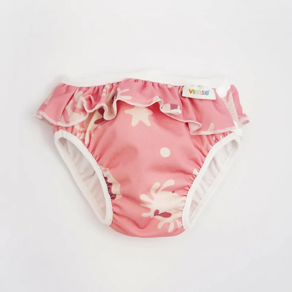 Fin pink badeble med motiv af havdyr. Takket være den bløde og smidige elastik i livet og ved benene, kan barnet bevæge sig frit rundt i vandet. Svømmebleen består af et lag blødt, lækagesikkert stof i tilfælde af uheld og flexibelt badetøjsstof på ydersiden.