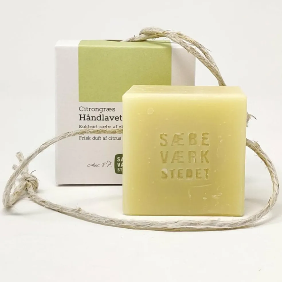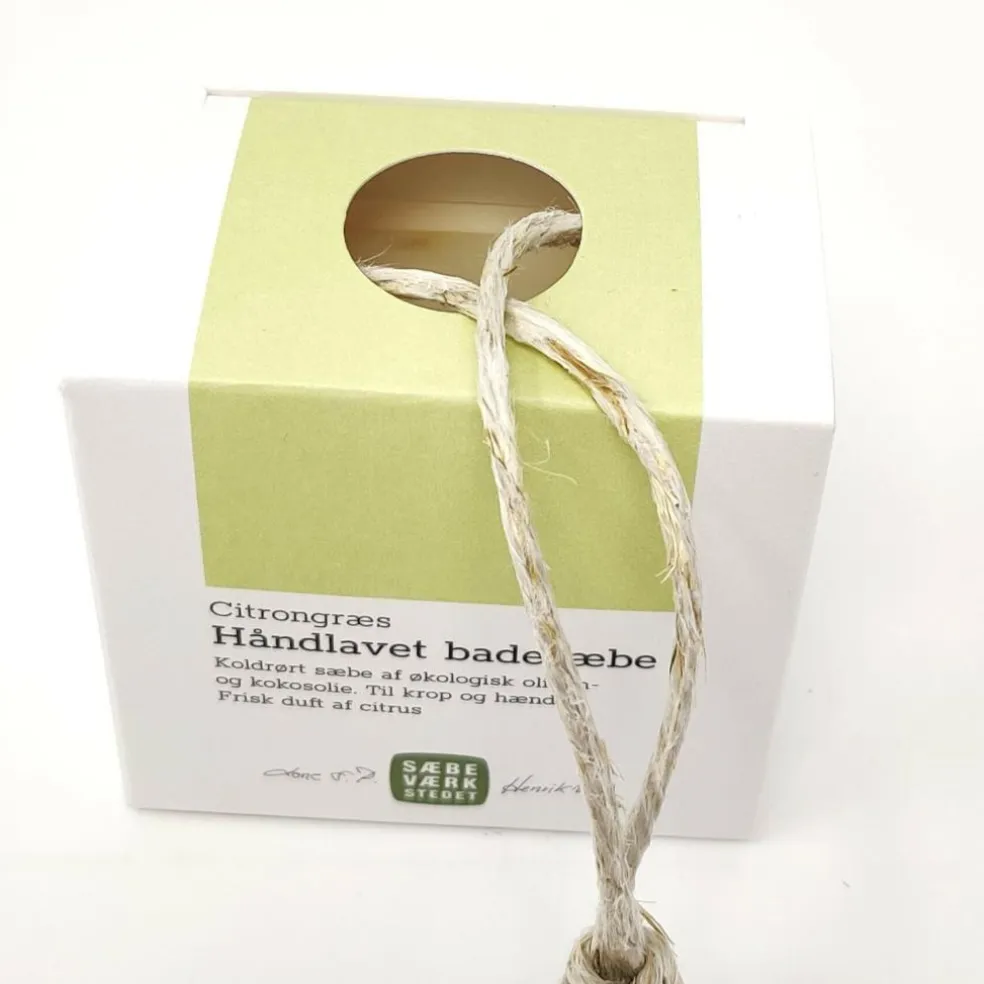 Sæben er fremstillet af økologisk oliven- og kokosolie og den dufter friskt og aromatisk af æterisk olie af Citrongræs. Sæben hænger på en hampsnor, så den holder sig tør og varer længe
