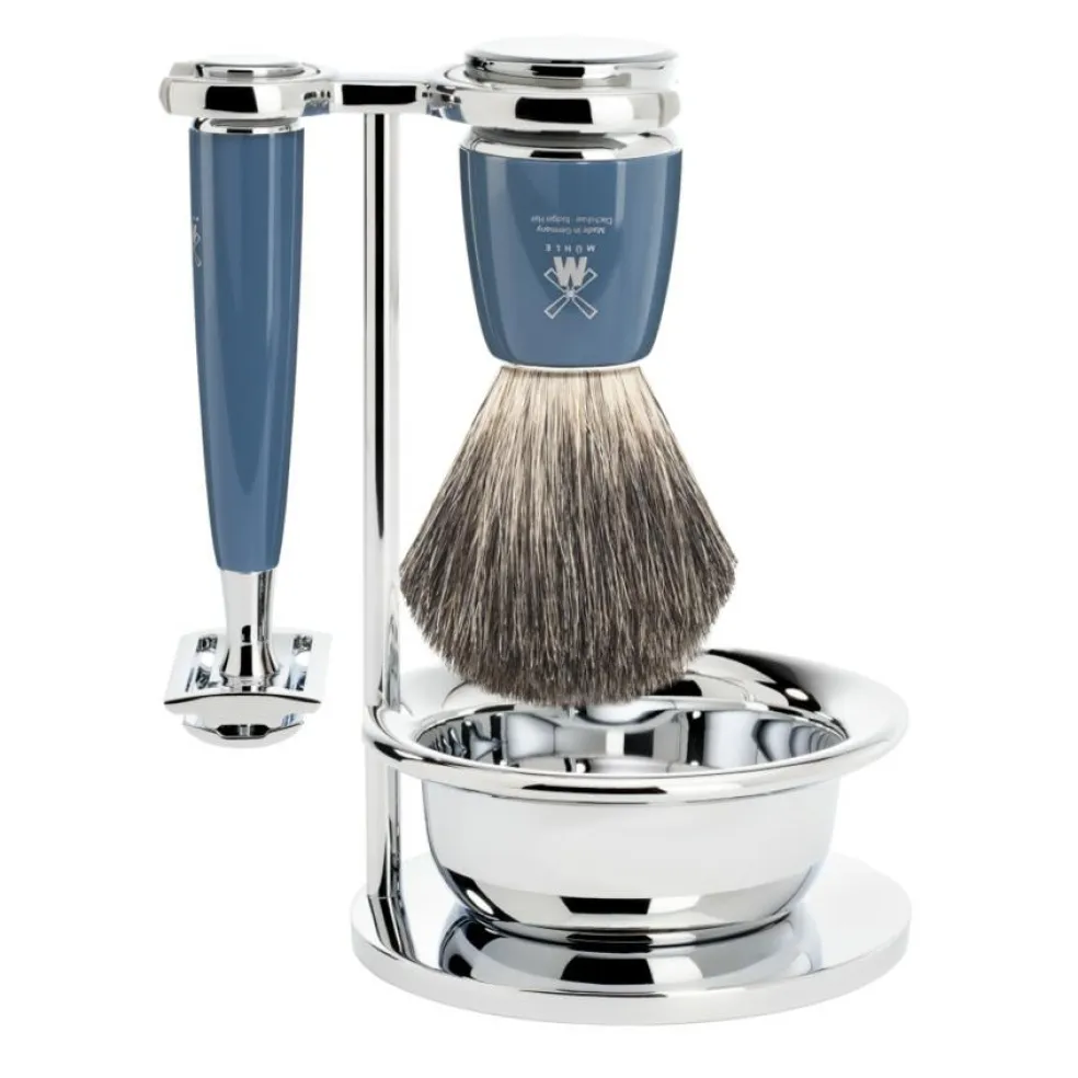 Dette barbersæt består af en barberkost med Pure Badger, der er den mest almindelige type grævlingehår, en DE-skraber, der bruger de klassiske DE-barberblade og en holder, hvorpå du kan hænge skraber og barberkost efter brug.