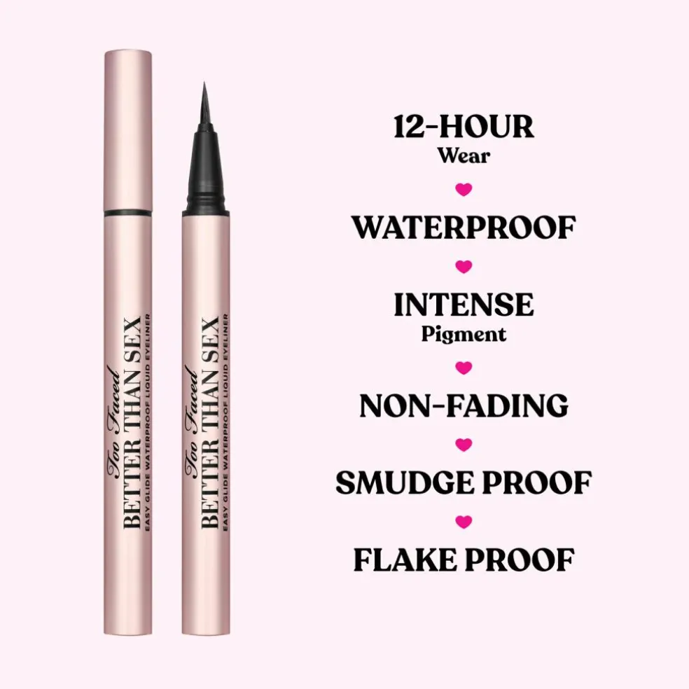 Med bare et strøg, får du en intens sort linje, der varer i 24 sexede timer. Kombinationen af Too Faced’s Easy Glide vandtætte formel og den innovative dobbeltfiberbørste skaber en eyeliner, der er så fantastisk, at den er… bedre end sex.