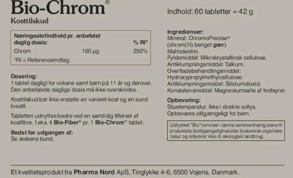 Chrom bidrager til at vedligeholde et normalt blodsukkerniveau og medvirker til en normal omsætning af kostens makronæringsstoffer.