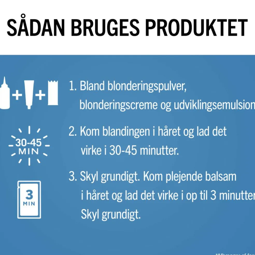 Tip: Hårafblegningen fungerer til alle hårtyper og er velegnet til nuancer fra lysblond til mørkblond. Hvis du har skulderlangt, krøllet eller tykt hår, anbefaler vi, at du bruger to pakker.