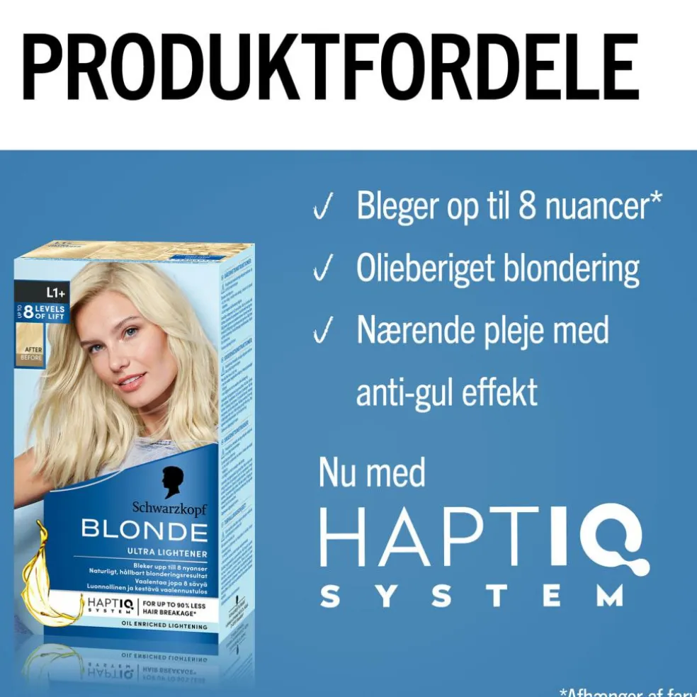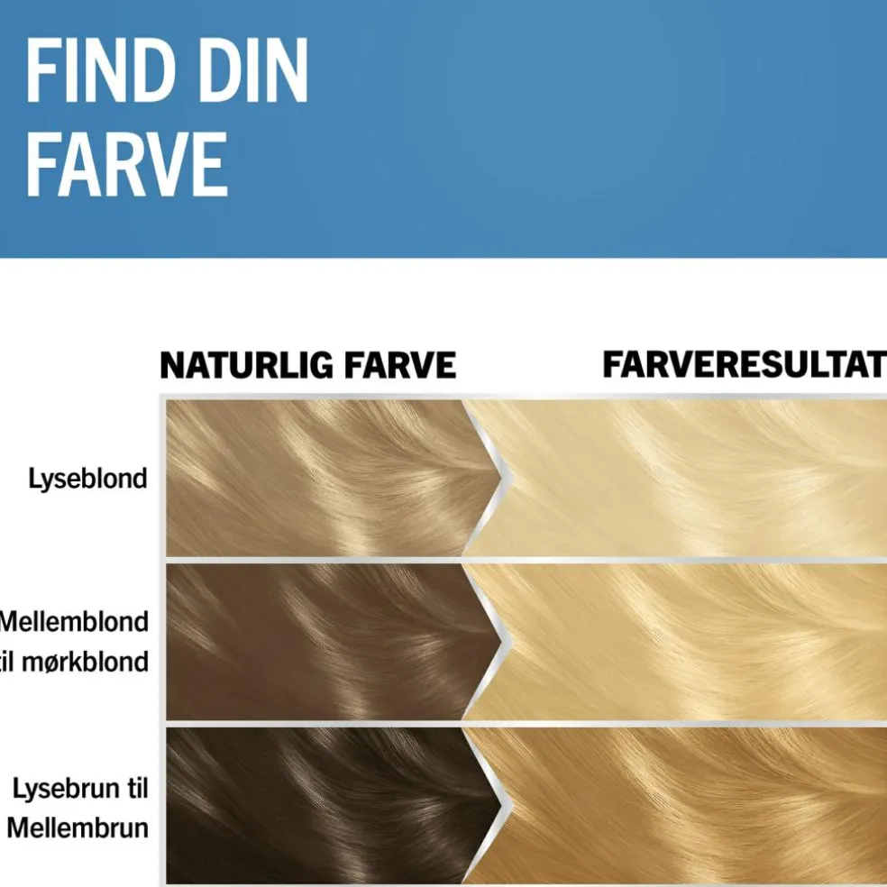 Tip: Hårafblegningen fungerer til alle forskellige hårtyper og er egnet til nuancer, der strækker sig fra lysblond til mellemblond. Hvis du har skulderlangt, krøllet eller tykt hår, anbefaler vi, at du bruger to pakker.