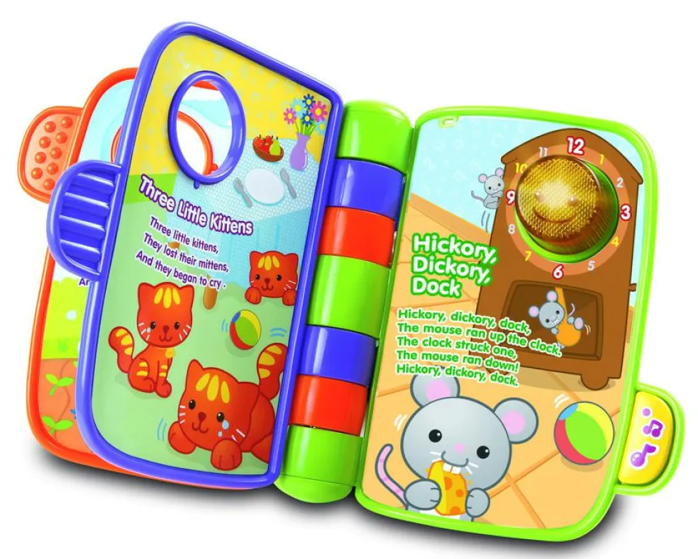 Kommer med syv populære børnerim og bevægelige dele til at styrke barnets motorik.