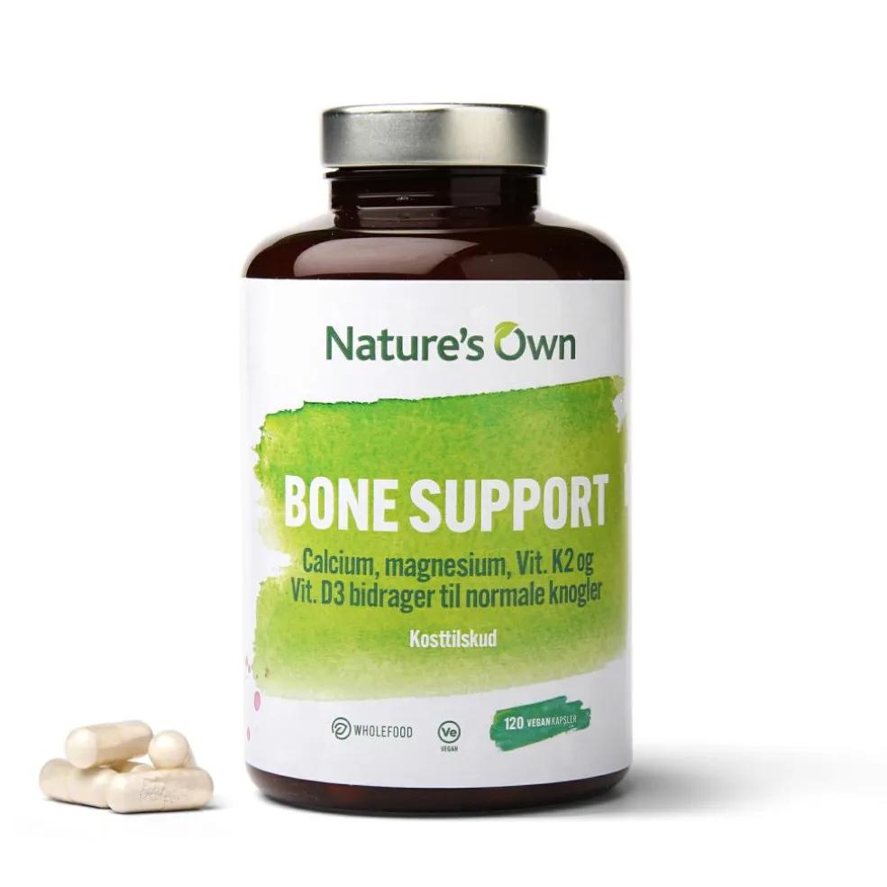 Nature’s Own Bone Support er et kosttilskud der indeholder calcium, magnesium, D3-vitamin, K2-vitamin og bor. Calcium, der bedre er kendt som kalk, bidrager sammen med magnesium og vitamin D3 til vedligeholdelsen af normale knogler og tænder.