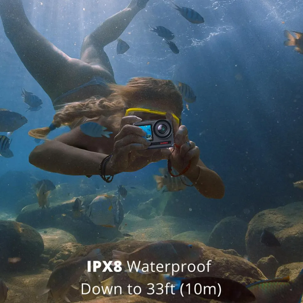Fang alle dine fantastiske øjeblikke – selv i vandet (IPX8)AKASO Brave 8 actionkameraet er IPX8 certificeret, hvilket betyder at det kan bruges helt ned til 10M uden ekstern beskyttelse. Så du kan sikkert og nemt benytte dit Brave 8 actionkamera i alt slags vejr og endda bruge det til forskellige aktiviteter som foregår i vandet, såsom snorkling og svømmeture.