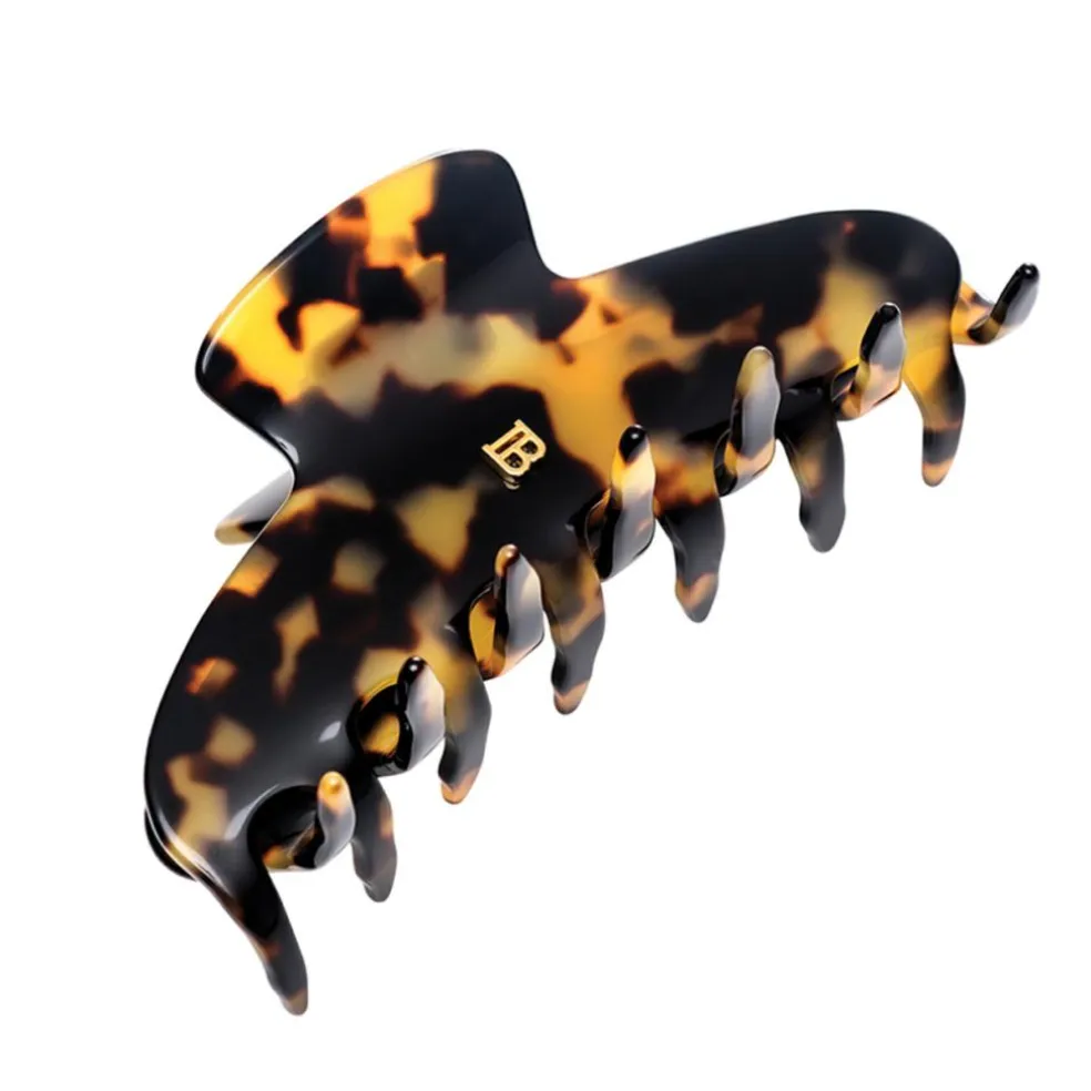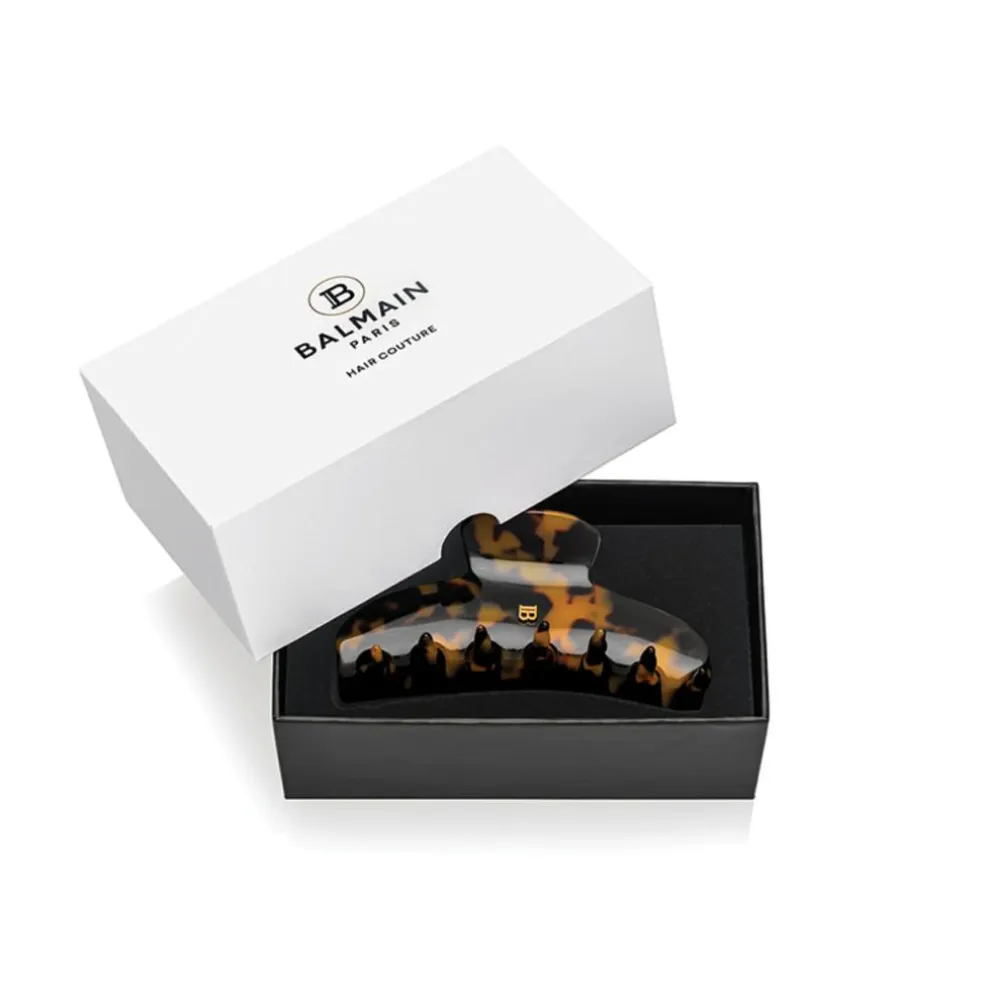 Balmain Paris Hair Couture’s Pince à Cheveux Large er en håndlavet hårklemme fremstillet af holdbart celluloseacetat og designet med Balmain’s karakteristiske 18K guldbelagte “B”-logo. Materialet er ekstremt stærkt, men samtidig fleksibelt, hypoallergent og skånsomt mod både hår og hovedbund. Den store klemme er specielt designet til tykt og langt hår og kan bruges til at trække håret tilbage i forskellige afslappede frisurer.