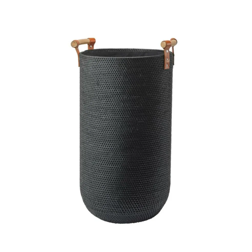 Med målene Ø 35 cm og højde 60 cm rummer kurven hele 58 liter – rigeligt til en families vasketøj. Den er forsynet med læderhåndtag, som gør den nem at flytte, og den indvendige lærredsforing sikrer, at tøjet opbevares beskyttet. Foringen kan desuden tages ud og rengøres, hvilket gør kurven praktisk i dagligdagen.