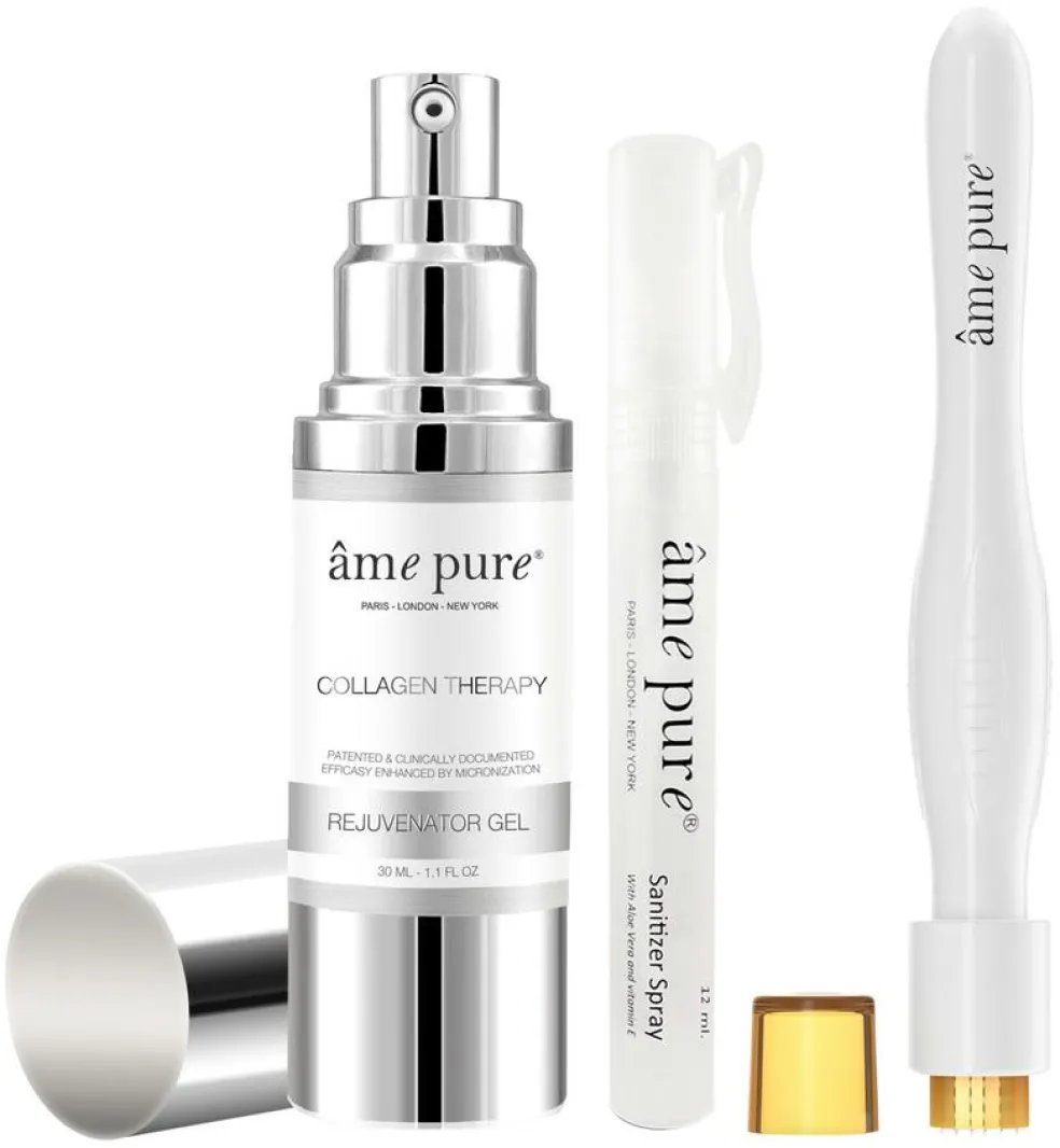 Collagen Therapy GEL™ er dermatologisk testet og uparfymeret. Opbevares i køleskabet for maksimal kølende effekt. âme pure™ Sanitizer Spray er en unik desinficerende spray, udviklet og formuleret for Collagen Induction Therapy.