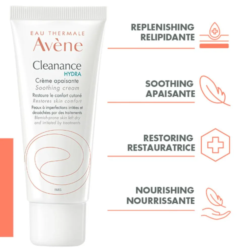 Cleanance HYDRA Soothing Cream er en beroligende og genopbyggende ansigtscreme til hud, der er tør og irriteret på grund af medicinsk behandling mod akne.