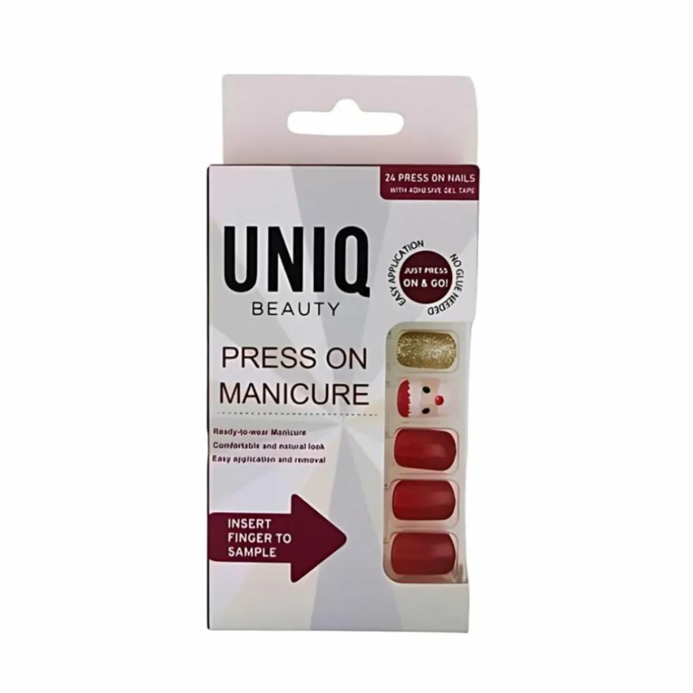 Få salon-kvalitets negle på ingen tid med UNIQ Click On / Press On Manicure Negle. I pakken finder du 24 Press on neglen med julemotiver. Neglene er designet til at give en naturlig længde med den ovale form.