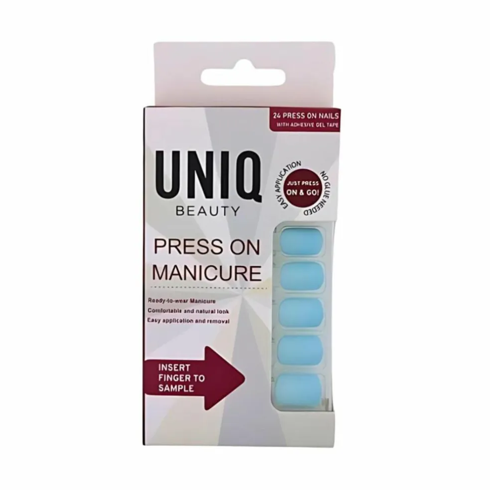 Få salon-kvalitets negle på ingen tid med UNIQ Click On / Press On Manicure Negle. I pakken finder du 24 lyseblå / Baby blue Press on negle, designet til at give en naturlig længde med den ovale form.