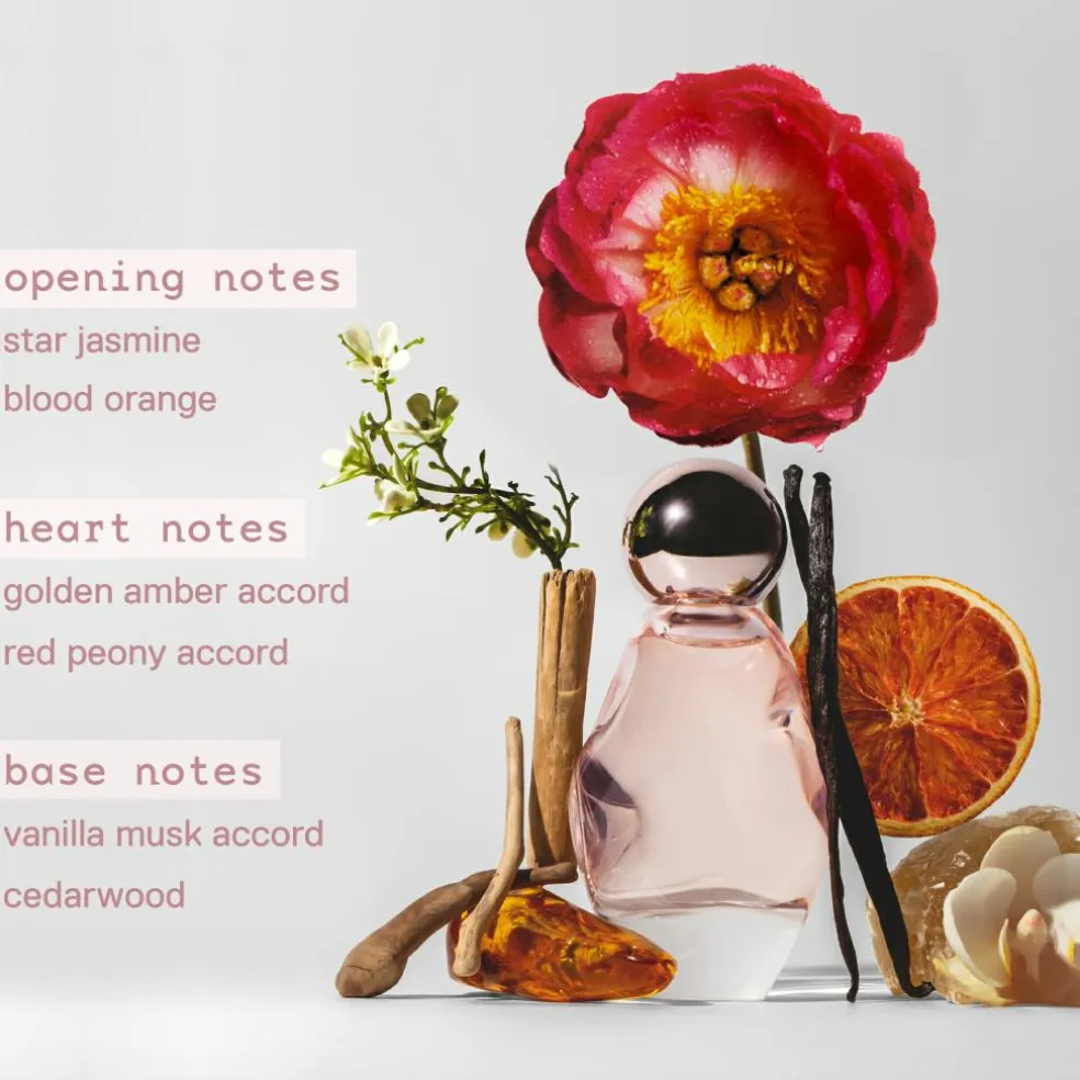 Hjertet udstråler fyldige toner af gyldent rav og rød pæon, mens en base af varmt cedertræ og vaniljemoskus giver en sød, omsluttende aroma.