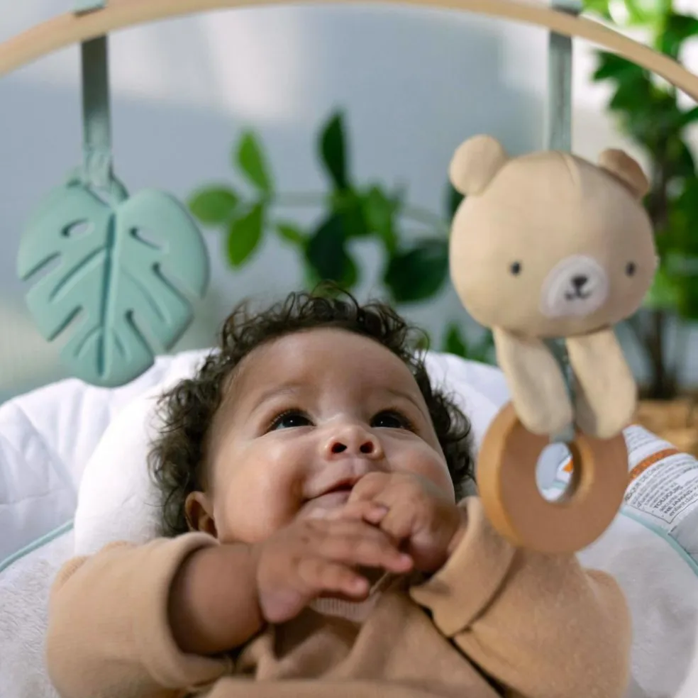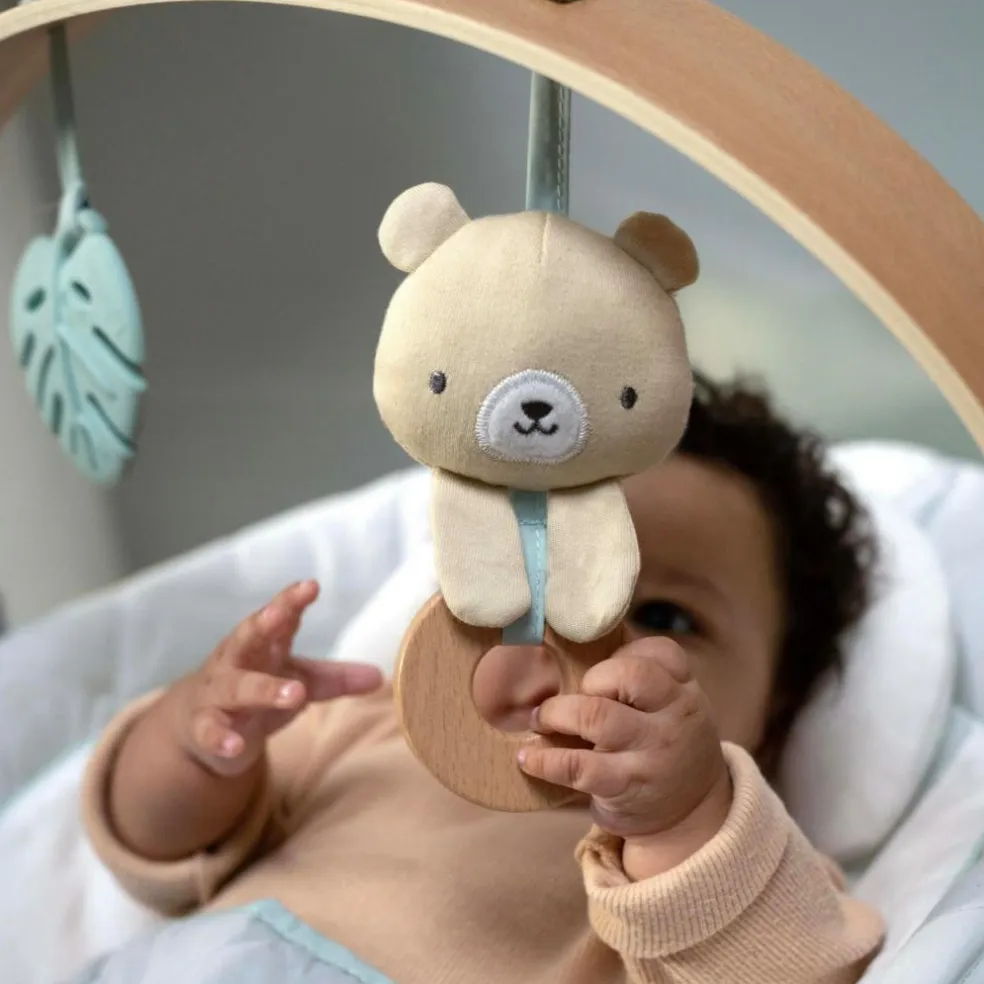 En aktivitetsbøjle, den super søde bamsebjørn Nate, som holder en træring, og et stort blad af silikone.