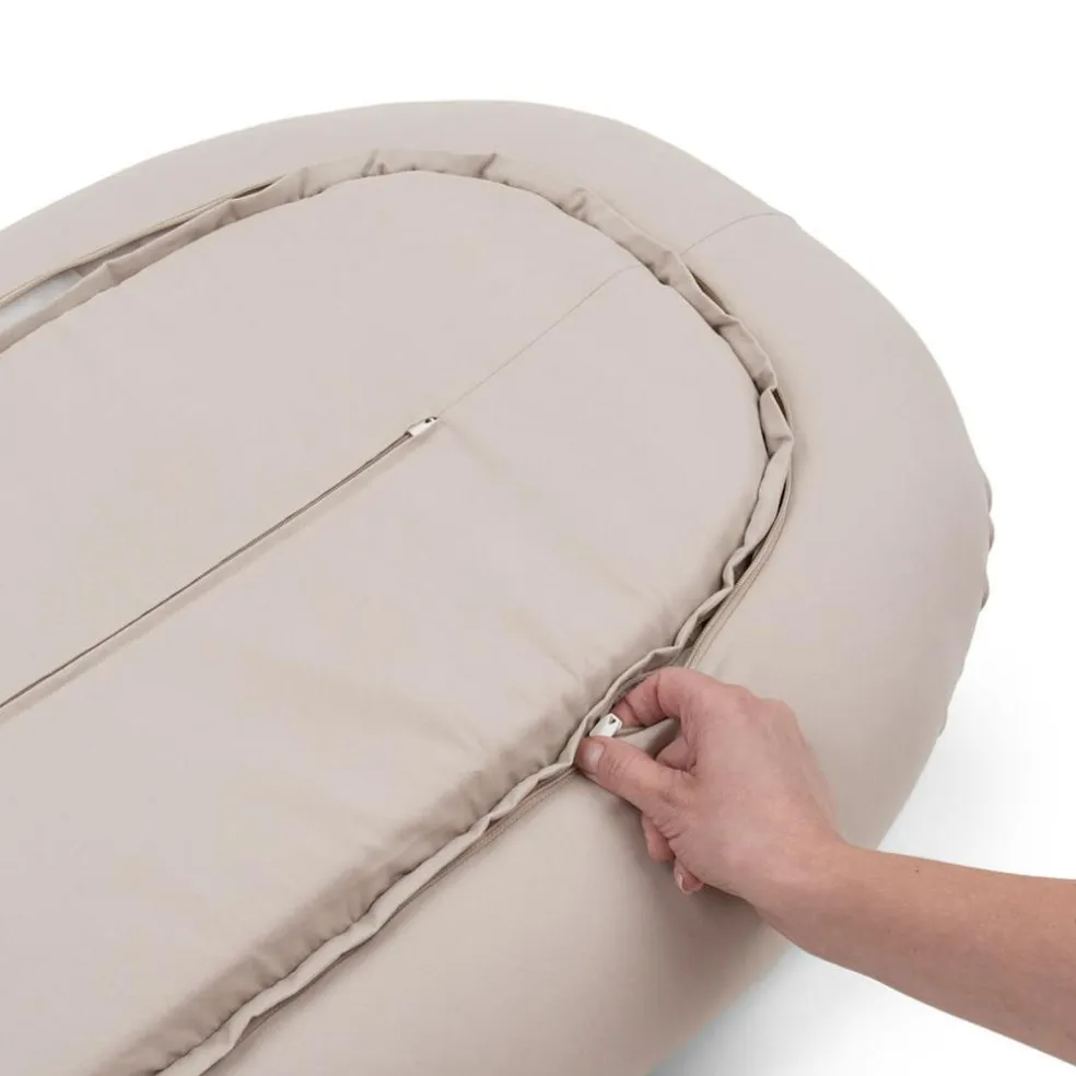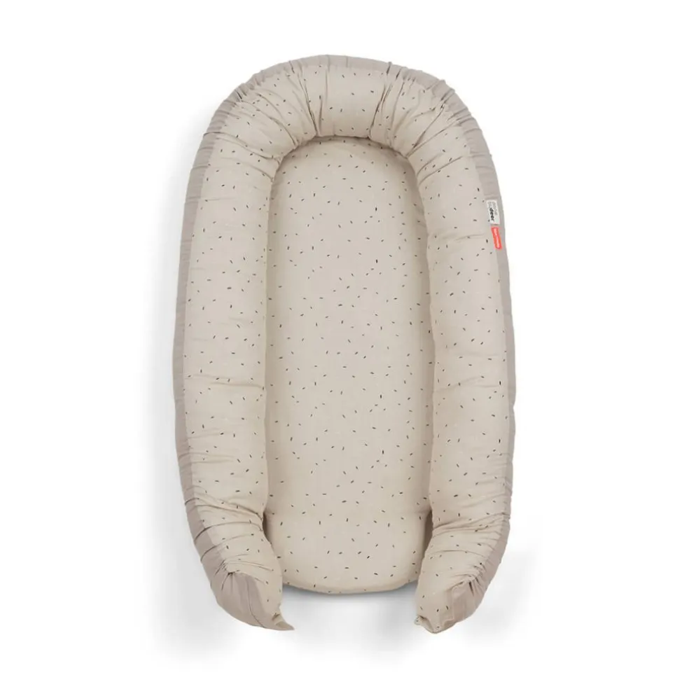 Gennem en skjult YKK sikkerhedslynlås kan madrassen tages ud og betrækket og fyldet kan vaskes for sig. Den sandfarvede nest er drysset med et festligt konfetti-print indvendigt og er på ydersiden helt enkel.