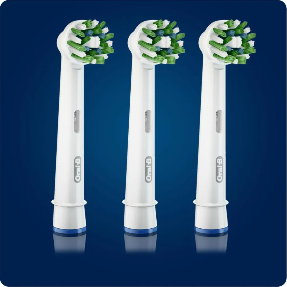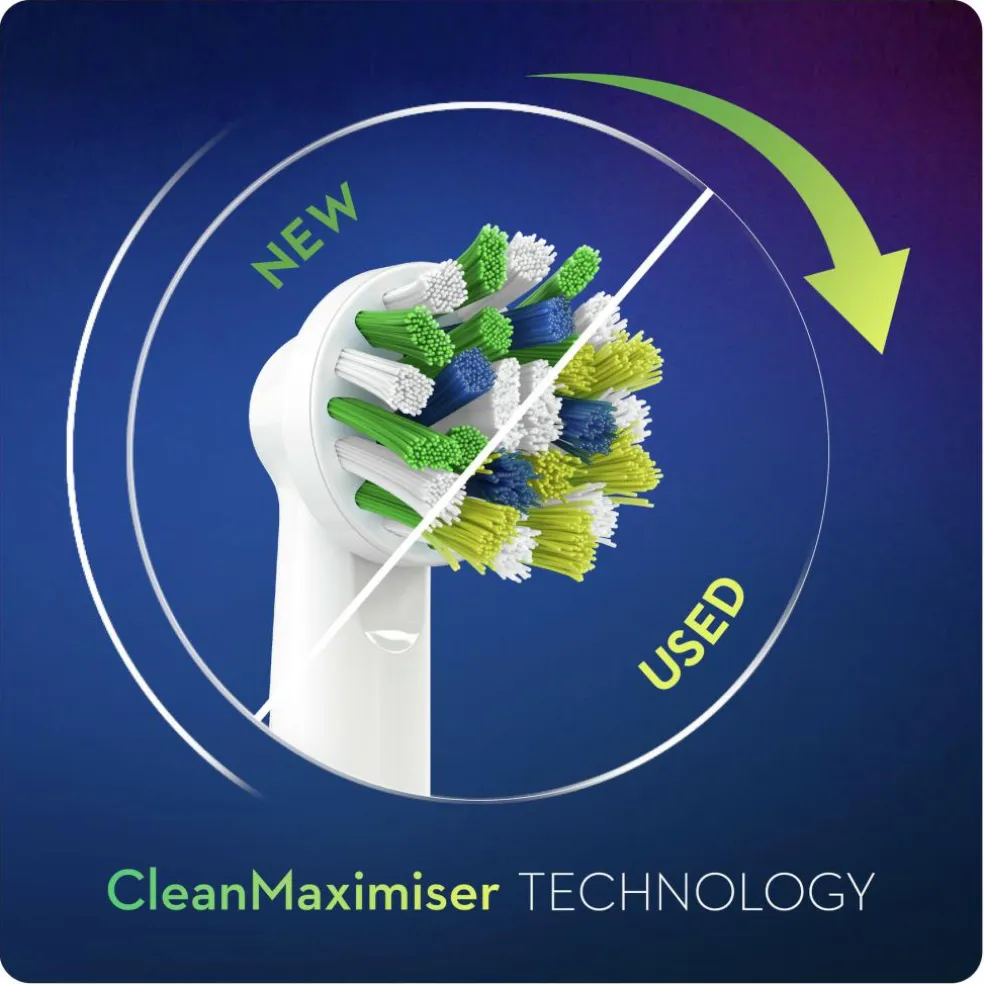 Oral-B’s forbedrede Cross Action børstehoveder er udviklet med CleanMaximiser-teknologi, der farver grønne børstehår gule, for at sikre det bedste resultat fra børstehovedet og den bedste tandbørstning. De unikke børstehår når dybt ind mellem tænderne for at fjerne plak og efterlader hele munden renere end med en almindelig manuel tandbørste.
