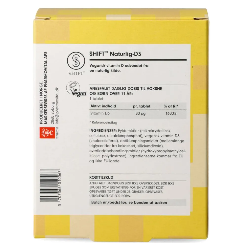 SHIFT Naturlig-D3 er produceret i Norge af Vitalkost AS og distribueres af Pharmovital ApS.