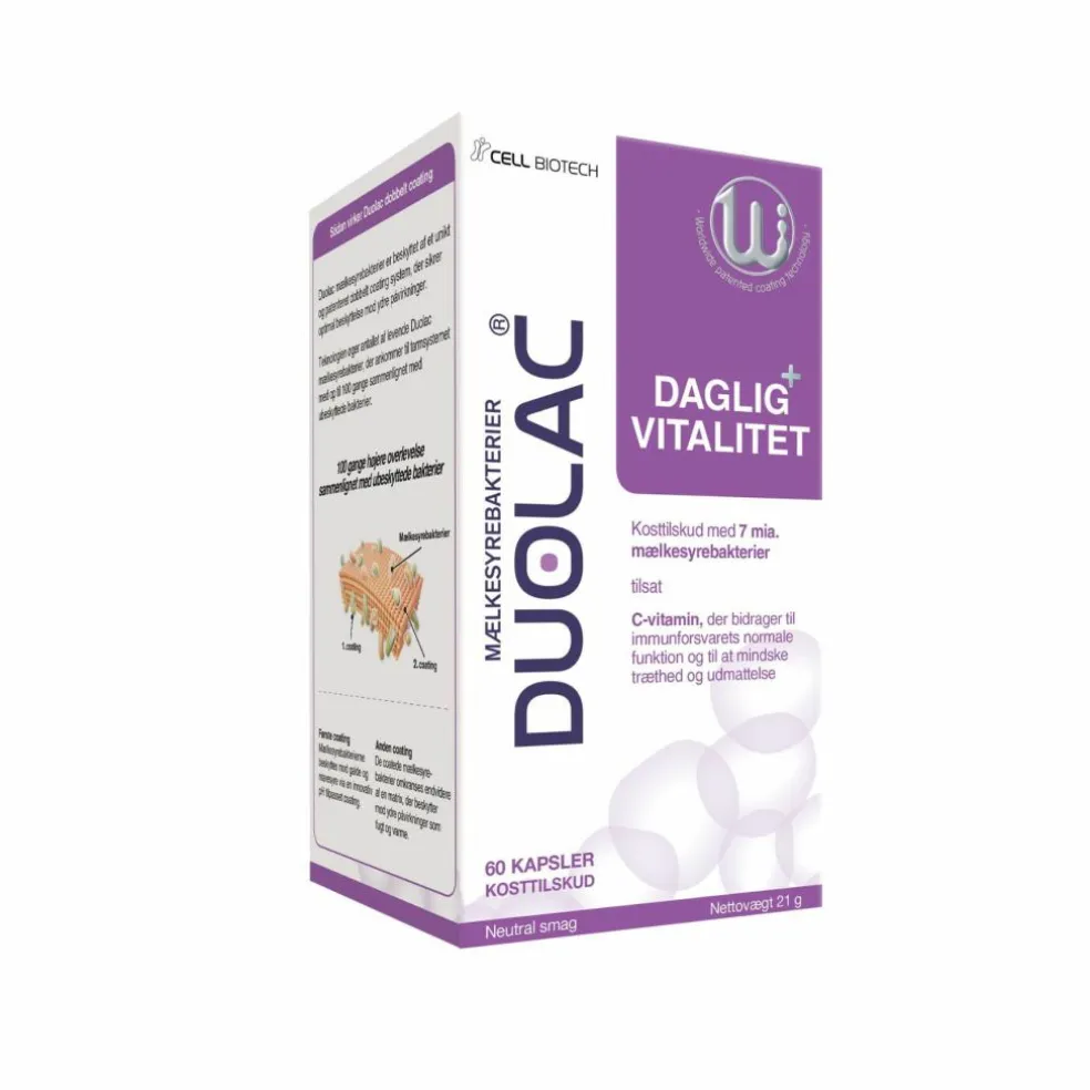 Mælkesyrebakterierne er beskyttet af Duolacs patenterede dobbelt coating teknologi, som sikrer, at op til 100 gange flere bakterier når frem til tarmsystemet sammenlignet med ubeskyttede bakterier. Fruktooligosakkarider (FOS) indgår også i produktet