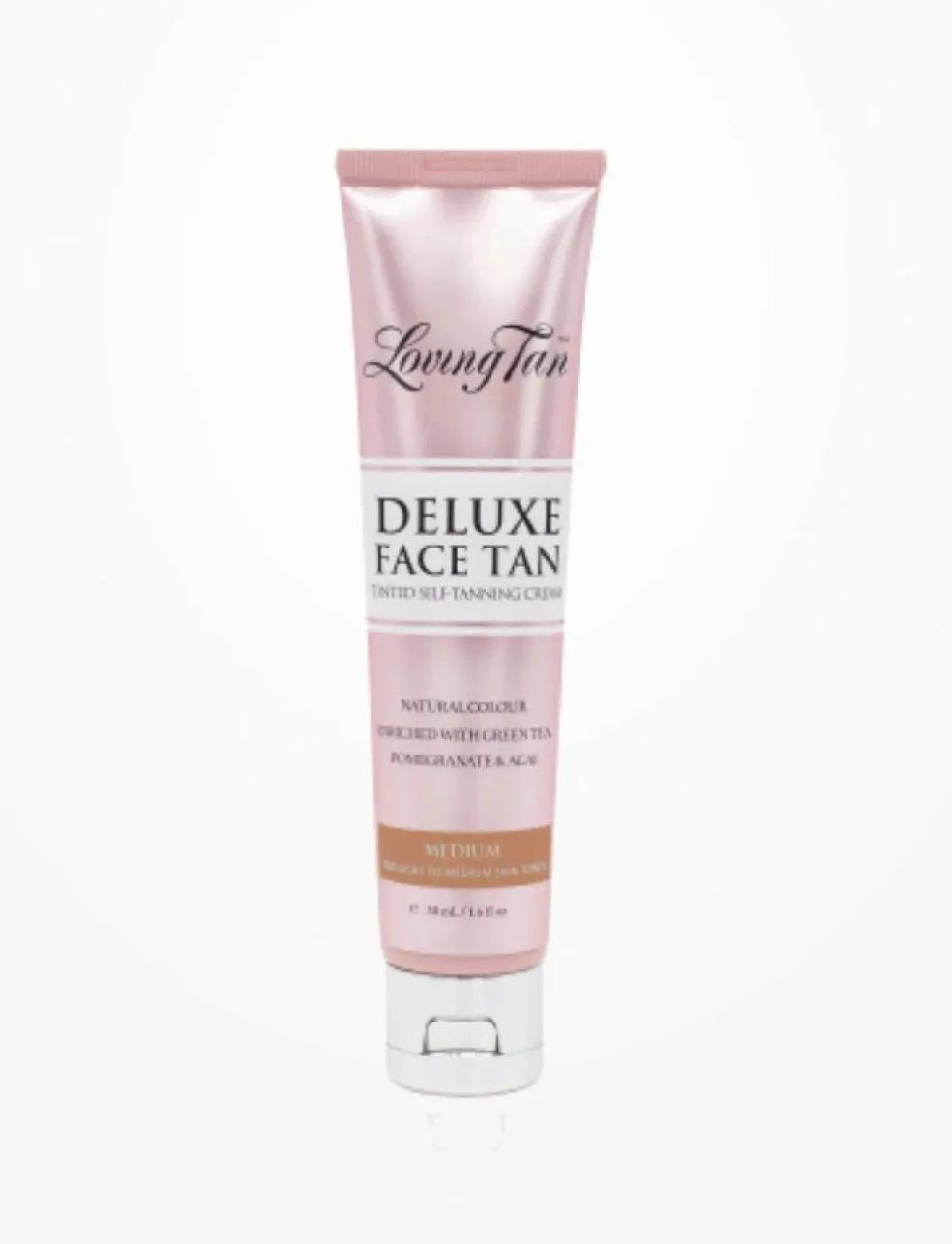 Vores Deluxe Face Tan er tilsat ekstrakt af aloe vera, grøn te, granatæble og acai og forbedrer din teint, mens den udvikler en naturlig og strålende solbrun farve.