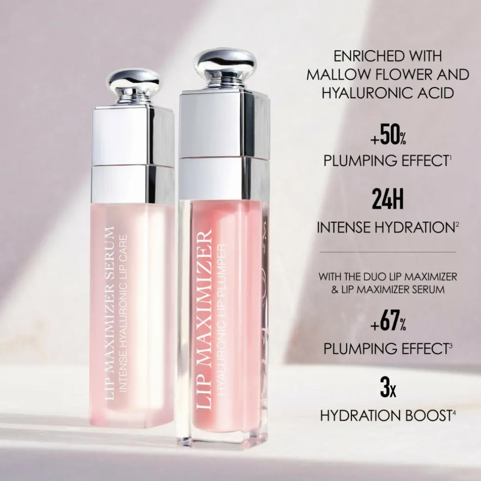 Dior Addict Lip Maximizer Serum er beriget med katostblomstekstrakt og hyaluronsyre og er formuleret som et ægte hudplejeprodukt i form af en emulsion, der fugter læberne intenst i 24 timer*, så de får yderligere volumen.