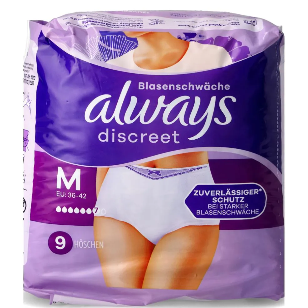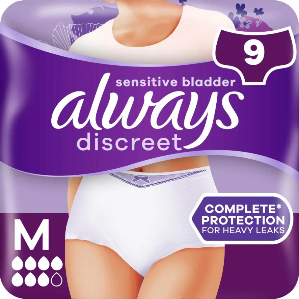 Lad ikke inkontinens forhindre dig i at være aktiv. Med Always Discreet Inkontinenstrusser Plus M kan du fortsætte din dag som normalt, selv når du oplever store mængder lækage forårsaget af pludselig trang. Det superabsorberende undertøj har RapidDry-teknologi, der hjælper med at lukke blærelækager og lugte inde på få sekunder. De dobbelte LeakGuards hjælper med at stoppe lækager, hvor de forekommer mest. Med 360° FormFit-form og en komfortabel designkerne, der giver en glat og behagelig pasform, kan du gå med ro i sindet, samtidig med at du har diskret, fantastisk beskyttelse på. Også velegnet til postpartuminkontinens.