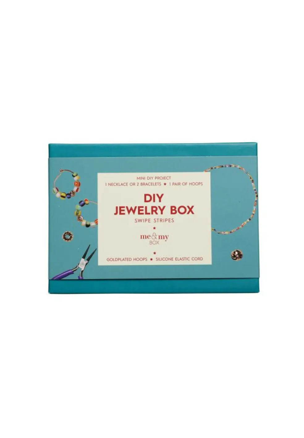 Boxen er fyldt med lækre striber og farverige farver. Lille og lækker eksklusiv box. Man trækker en lille skuffe ud, som indeholder alle smykkedelene samt et lille velkomstkort med en QR kode, der giver direkte afgang til inspiration og DIY teknikker.