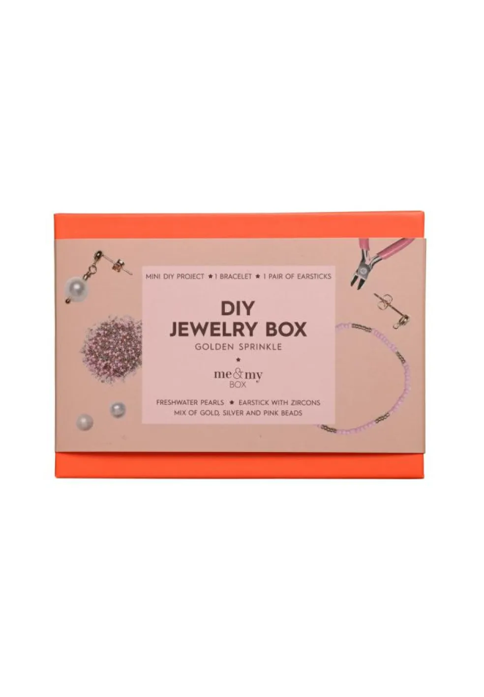 Projektet indeholder 1 elastik armbånd med lyserøde og guldbelagte glasperler, et par guldbelagte ørestikker med en klar zirkon og 2 ægte hvide natur ferskvandsperler og perlestave. Lækker lille eksklusiv kvalitetsbox, som kan blive til et flot armbånd og øreringe.