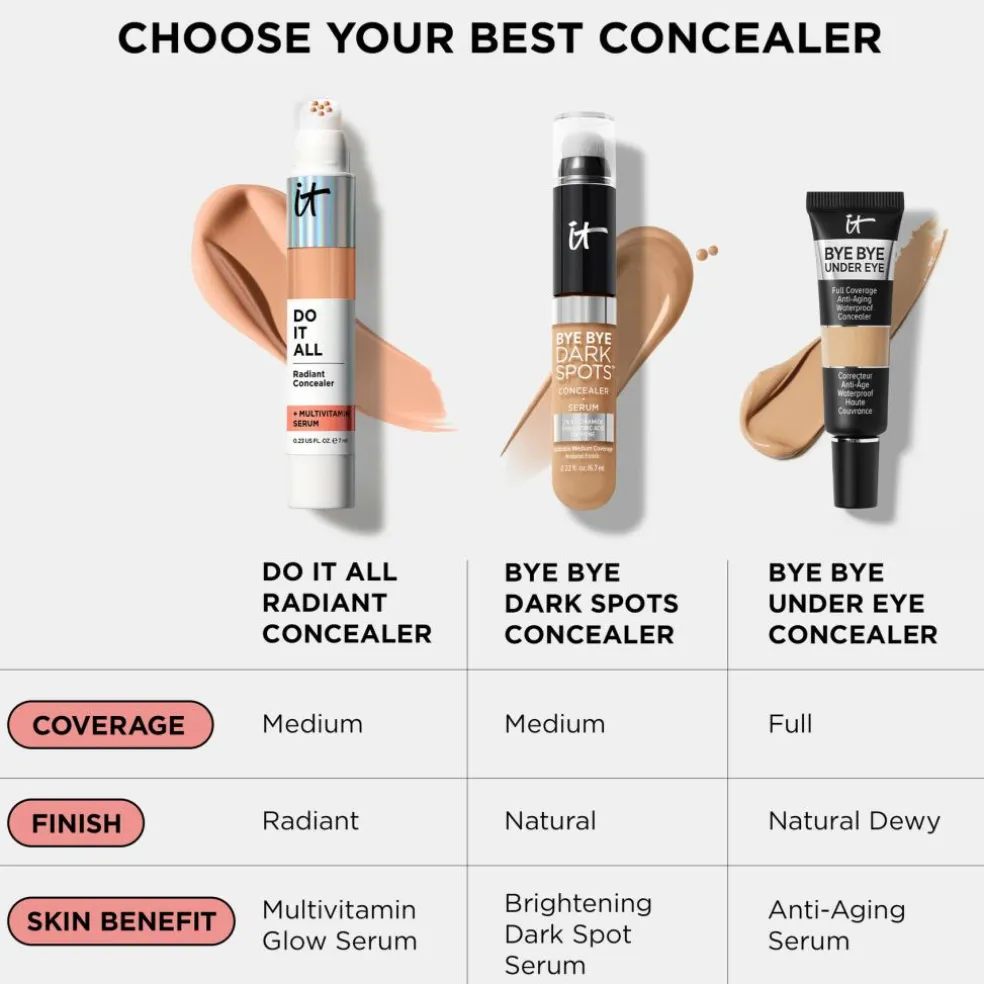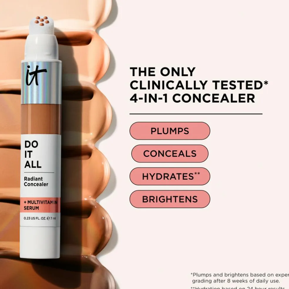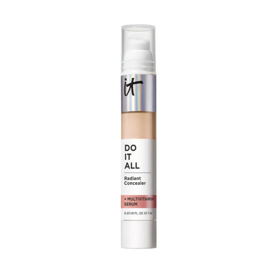 DERFOR VIL DU ELSKE DETHvorfor nøjes, når du (og din concealer) kan det hele? Bare klik, fyld ud og få glød, der holder hele dagen og ikke lægger sig i fine linjer. Denne 4-i-1 strålende concealer, der er udviklet i samarbejde med læger, giver en strålende medium dækning og er klinisk testet* til at udfylde rynker, skjule skønhedsfejl, fugte** tørhed og lysne mat hud. Med et multivitaminserum hjælper den med at forbedre hudens tekstur og glød, samtidig med at den låser 24 timers fugt inde. -Medium dækning -Holder i op til 16 timer – Strålende finishVIGTIGE FORDELE -Klinisk testet*, 4-i-1 serum concealer -Aapplikator med blød spids, der er nem at bruge: 1 klik for at skjule pletter og 3 klik for fuld dækning – Op til 16 timers holdbarhed + 24 timers fugt-Opfyldende + multivitaminserum: Med hyaluronsyre, niacinamid, B5- og E-vitamin, der hjælper med at forbedre hudens fugt, tekstur og glød-Øjeblikkelig udglatning: Blødt, fokuseret pudder udglatter hudproblemer -Glød uden rynker: Aminosyrebelagte pigmenter, der øjeblikkeligt kan tones ud og ikke krakelerer eller lægger sig i fine linjerÆGTE SKØNHED, ÆGTE RESULTATERIT Cosmetics er udviklet på baggrund af plastikkirurgers viden og dermatologers ekspertise inden for ingredienser og hudpleje og udvikler problemløsende, hudvenlige formler, der giver dig ægte resultater.*Giver fylde og lysner efter 8 ugers daglig brug, baseret på ekspertvurdering. **Fugtighed baseret på 24-timers resultater.AnvendelseKLIK PÅ DENVed første brug skal du dreje bunden i ca. 1 minut, indtil concealeren kommer til syne, da formlen er beskyttet for at sikre, at friskheden forbliver låst inde. Derefter er det 1 klik for målrettet concealing eller 3 klik for glød over det hele.PÅFØR DENPåfør direkte på det ønskede område. Stryg udad. Dup og ton farven ud med en stor, blød børste som vores Heavenly LuxeTM Complexion Perfection No. 7 Brush.RENS DEN Start med forsigtigt at tørre overskydende produkt af applikatorens overflade. Brug en vatpind til med let hånd at tørre eventuelle rester af concealerspidsen.
