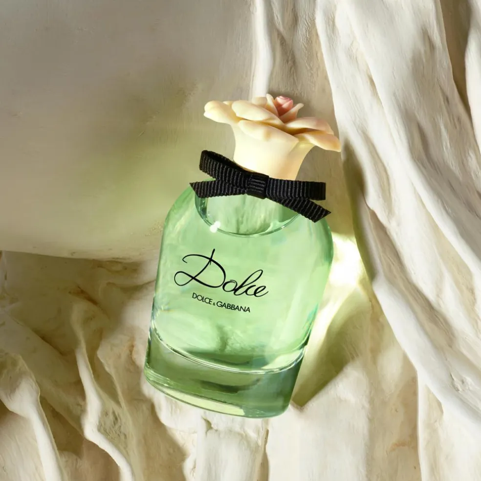 Dolce&Gabbana Dolce Eau de Parfum’s elegant designede flakon, prydet med et smalt sort grosgrain-bånd, minder om antikke parfumeflakoner, mens det tunge, klare glas med afrundede konturer afspejler nutidig, moderne smag.