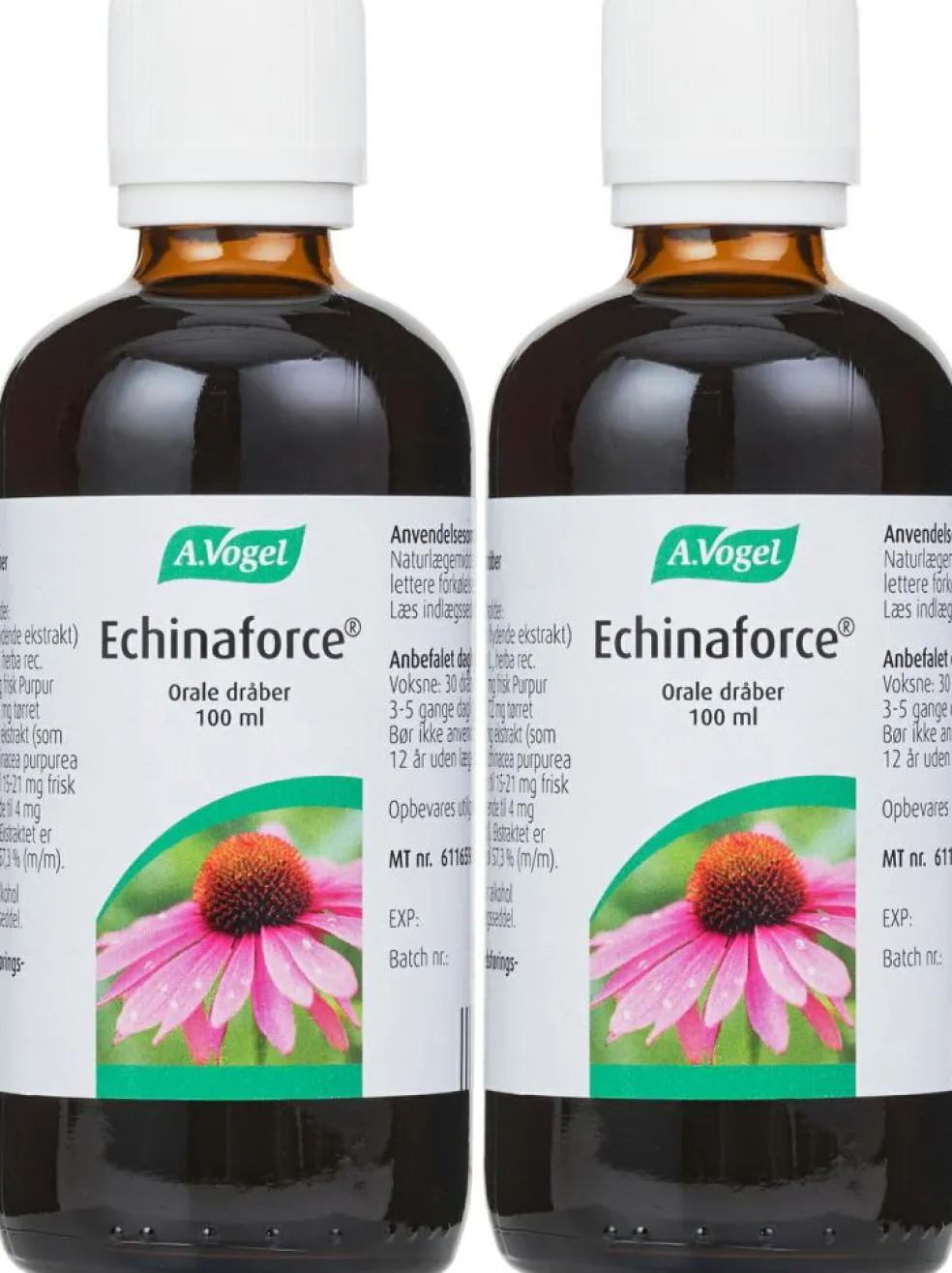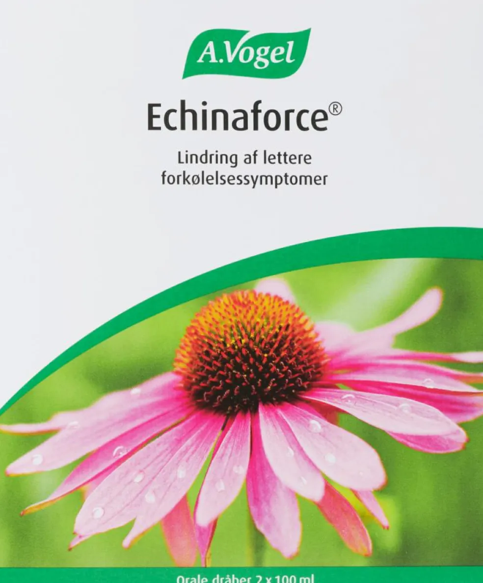 Echinaforce® Orale dråber (udtræk af Purpur solhat), pakningsstørrelser 50 ml / 100 ml / 2×100 ml. Læs omhyggeligt indlægssedlen. Indikationer: Naturlægemiddel til brug ved lindring af lettere forkølelses- symptomer. Styrker kroppens immunforsvar og øger derved modstandskraften overfor forkølelse. Do- sering: Voksne: 30 dråber i et glas vand 3-5 gange daglig i højst 8 uger. Må kun efter aftale med læge anvendes til gravide, ammende eller børn under 12 år. Særlige advarsler og forsigtighedsregler inden brugen: Bør ikke bruges sammenhængende i mere end 8 uger af gangen. Kontakt læge ved forvær- ring af symptomer eller høj feber. Allergiske patienter skal kontakte lægen inden brug. Præparatet indeholder ethanol (65% Vol.) og må derfor ikke anvendes, hvis du er i behandling med disulfiram (mod alkoholisme) eller metronidazol (mod betændelse). Kontraindikationer: Overfølsomhed over for planter af kurvblomstfamilien (f.eks. krysantemum eller bynke). Tuberkulose, leukæmi, bindevævssygdomme og andre auto- immune sygdomme. Dissemineret sklerose. HIV-infektion, anden immundefekt eller immunosupression. Sygdomme relateret til hvide blodlegemer.Forkortet produktinformation er baseret på produktresumé dateret 20. januar 2020, som kan rekvireres hos A. Vogel Danmark A/S på tlf. 8770 8770 eller www.produktresume.dk15-5-2020/MNI