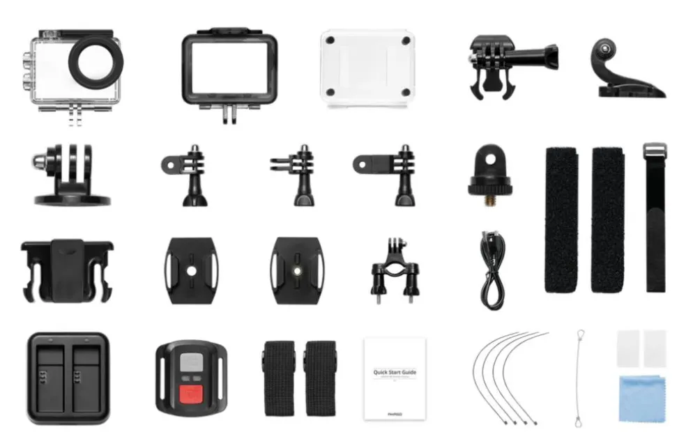 Ved køb af AKASO EK7000 Pro medfølger1x AKASO EK7000 Pro Action Camera | 1x 2.4G Remote Control | 1x Battery Charger | 2x 1050mAh Battery | 1x Waterproof Case | 1x Handle Bar/Pole Mount | 7x Mount | 2x Clip | 2x Helmet Mounts | 1x Bandages | 5x Tethers | 1 x Protective Backdoor | 1x USB Cable | 1x Lens Cloth |1x Quick Reference Guide