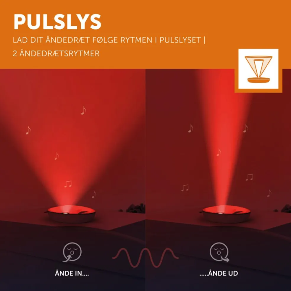 Ved at lytte til vejrtrækningslyde og se pulslyset blive større og mindre, vil den lille automatisk følge rytmen og lettere falde i søvn.
