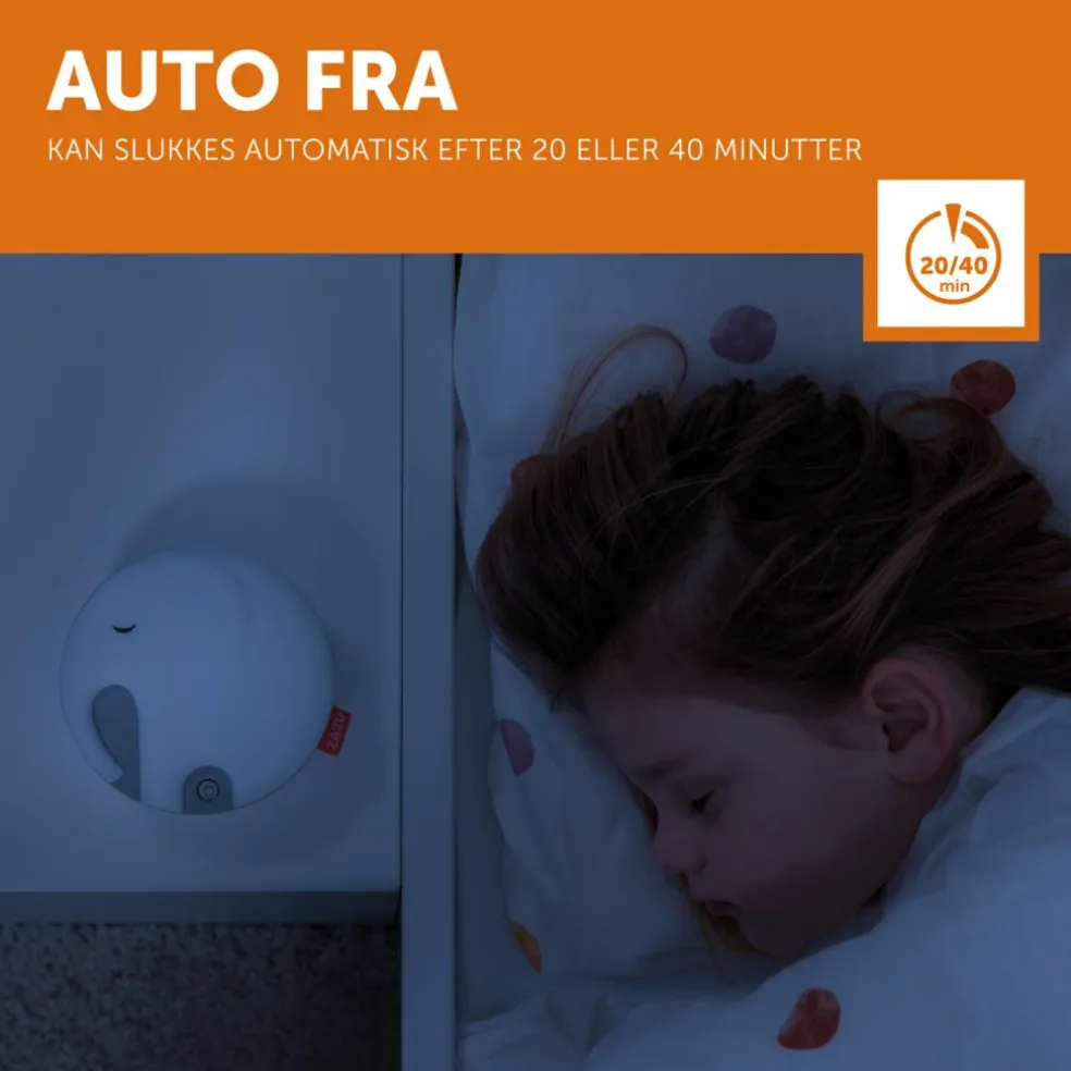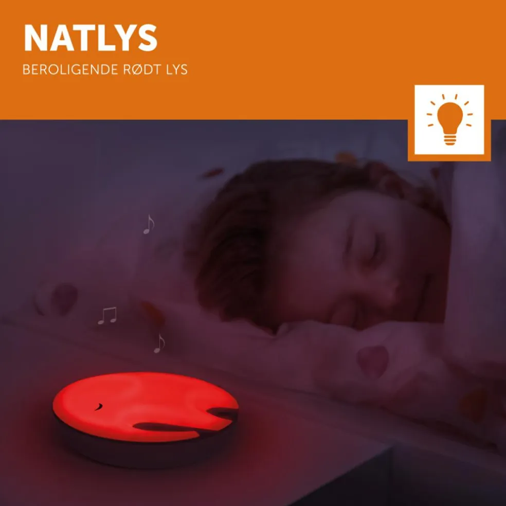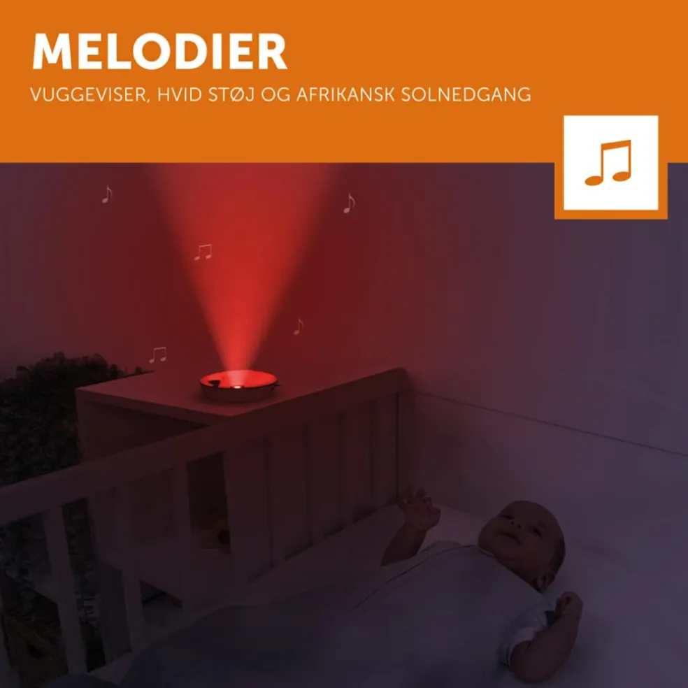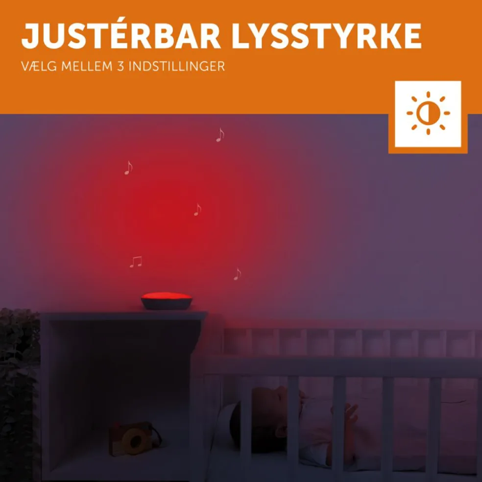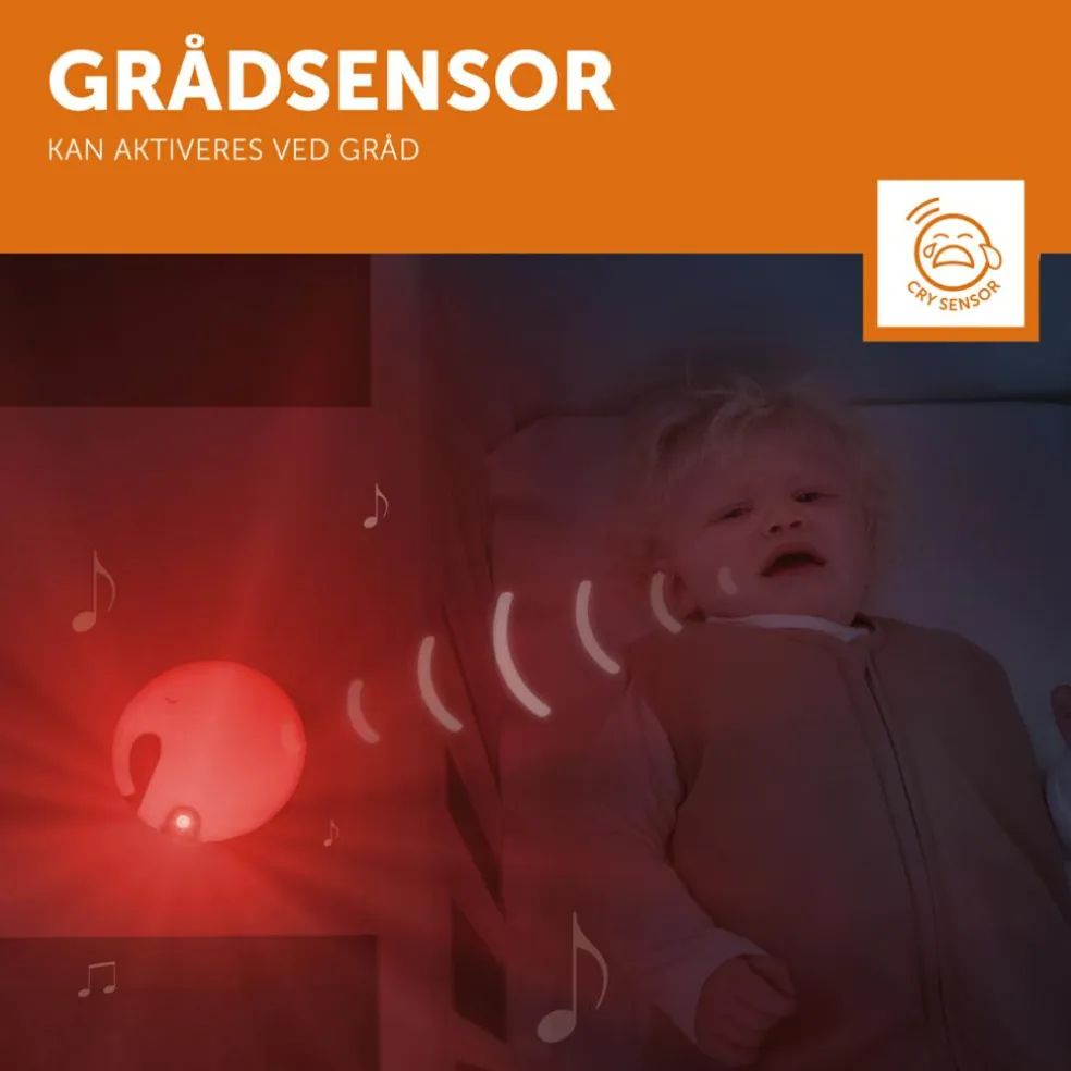 Den har en grædesensor, så lyset og/eller lyden automatisk kan aktiveres, hvis dit barn skulle blive uroligt i løbet af natten.