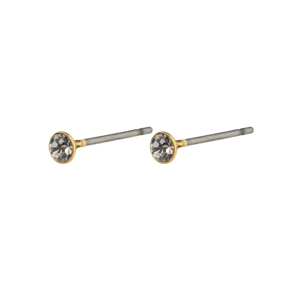 Et par petit krystal øreringe, med et ultra enkelt og klassisk udtryk. Øreringene måler 3 mm og er oplagte at benytte i huller op langs øret, i kombi med andre øreringe. Er også flotte i et ultra enkelt look, hvor de shiner, som et enkelt lille glimt i dine ører. Presioca krystallen er monteret i en guldbelagt indfatning, mens staven der går igennem øret er af kirurgisk stål.