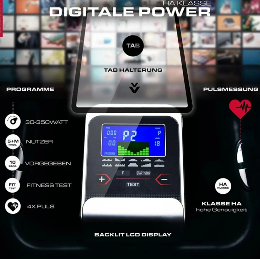 Baggrundsbelyst LCD-display for letlæselige træningsdata. 21 træningsprogrammer, herunder puls- og wattspecifikationer. Kompatibel med Kinomap-appen for interaktiv træning. Bluetooth®-interface for trådløs forbindelse til enheder.