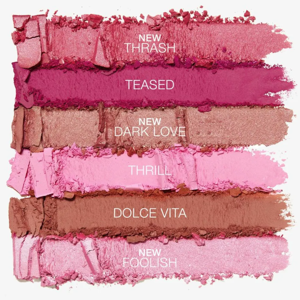 Marker og fremhæv med de matte nuancer Thrill, Teased og Dolce Vita, samt nye komplementære shimmer nuancer Foolish, Thrash og Dark Love.