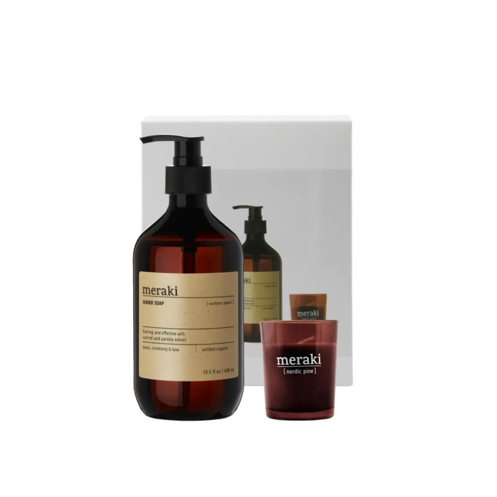 Overrask en du holder af med denne gaveæske fra Meraki, uanset anledningen. Nyd duften af frisk appelsin, cedertræ og sød balsamico, mens du vasker dine hænder med den populære og cerificeret økologiske Northern Dawn håndsæbe. Økologiske ekstrakter fra gulerod og persille nærer, renser og fugter dine hænder. Duftlyset har en brændetid på 12 timer og spreder en skøn duft med krydrede noter i hjemmet. Den specifikke duftvariant for lyset kan variere. En duo som er helt hjemme i både køkken og badeværelse.