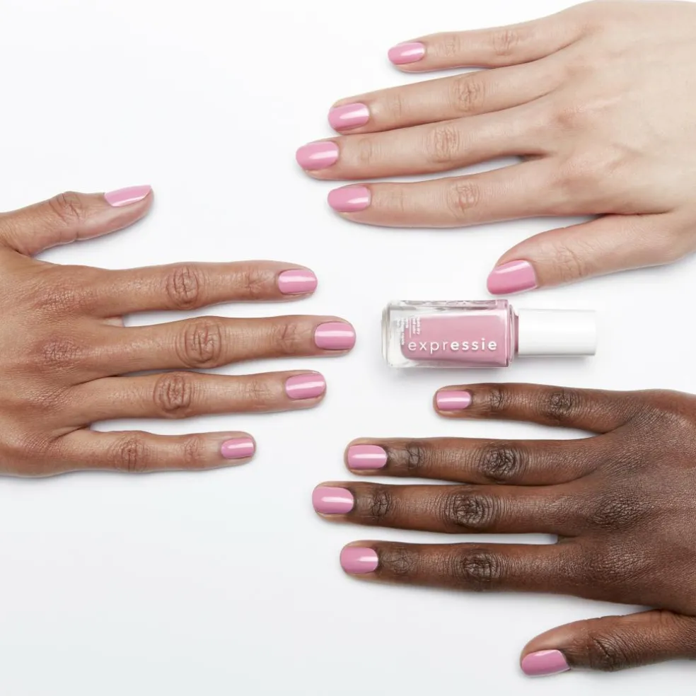 essie expressie in the time zone er en hurtigtørrende pastellyserød neglelak med blå undertoner