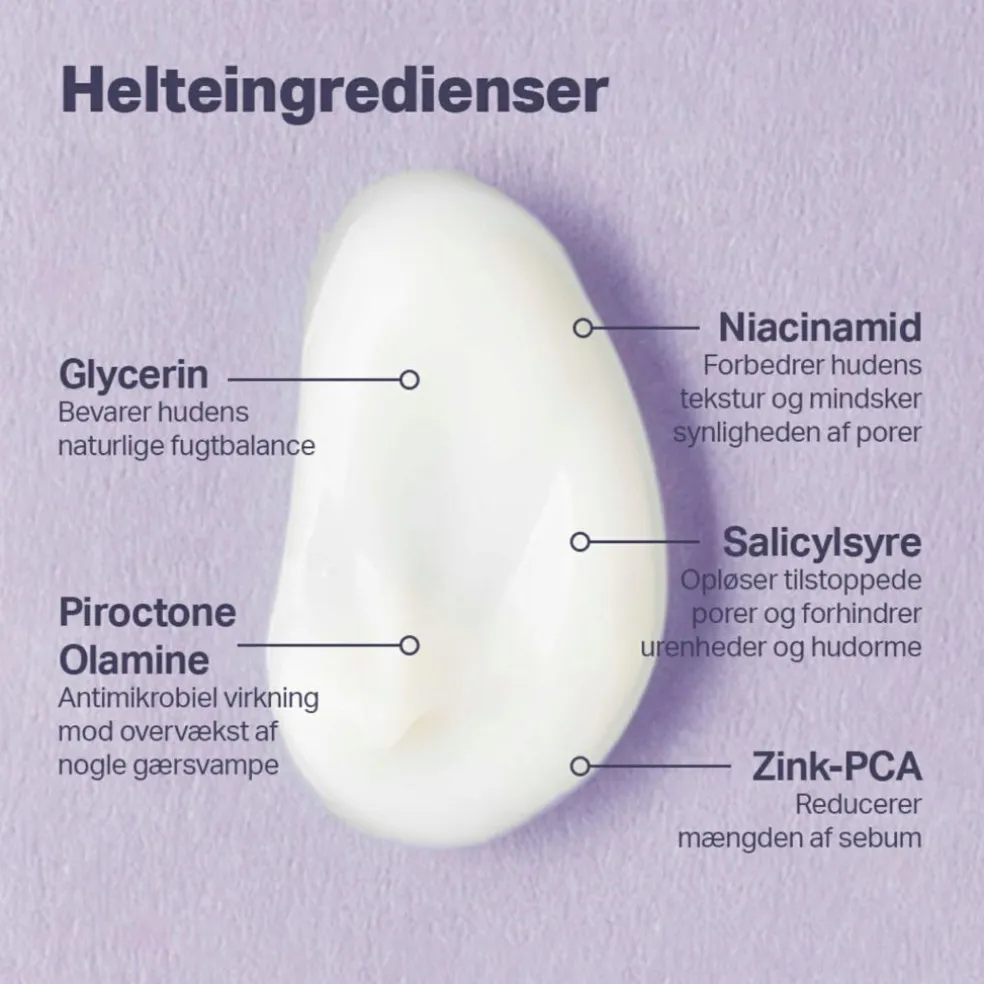 Med 4% niacinamid forbedres hudens elasticitet, samtidig med at det modvirker rødme og irritation. Zinc PCA og 1,5% salicylsyre mindsker aktivt urenheder og reducerer dannelsen af sebum (talg).
