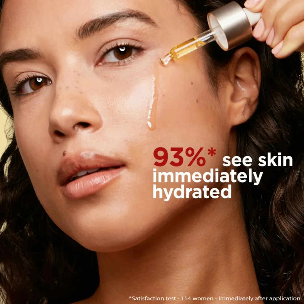 - Få dråber varmes op i håndfladerne og påføres med lette tryk på ansigt og hals hver aften.