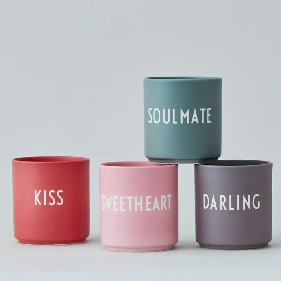 De superpopulære kopper i lækre farver, designet i den fineste ultra-mat glaserede porcelænskvalitet med skønne ord indgraveret på fronten.