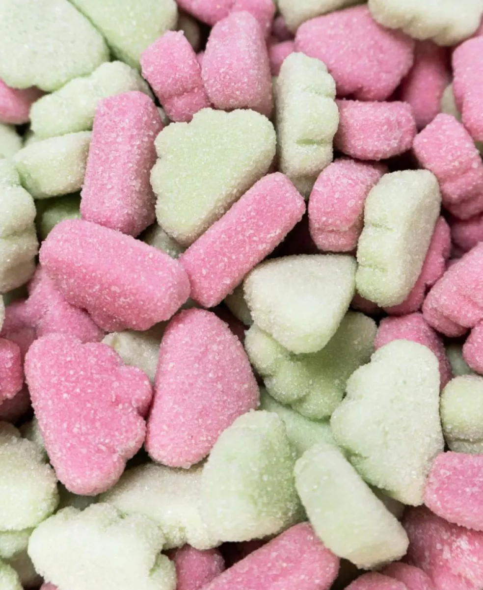 Syrlig vingummi med jordbærsmag og æblesmag uden tilsat sukker.